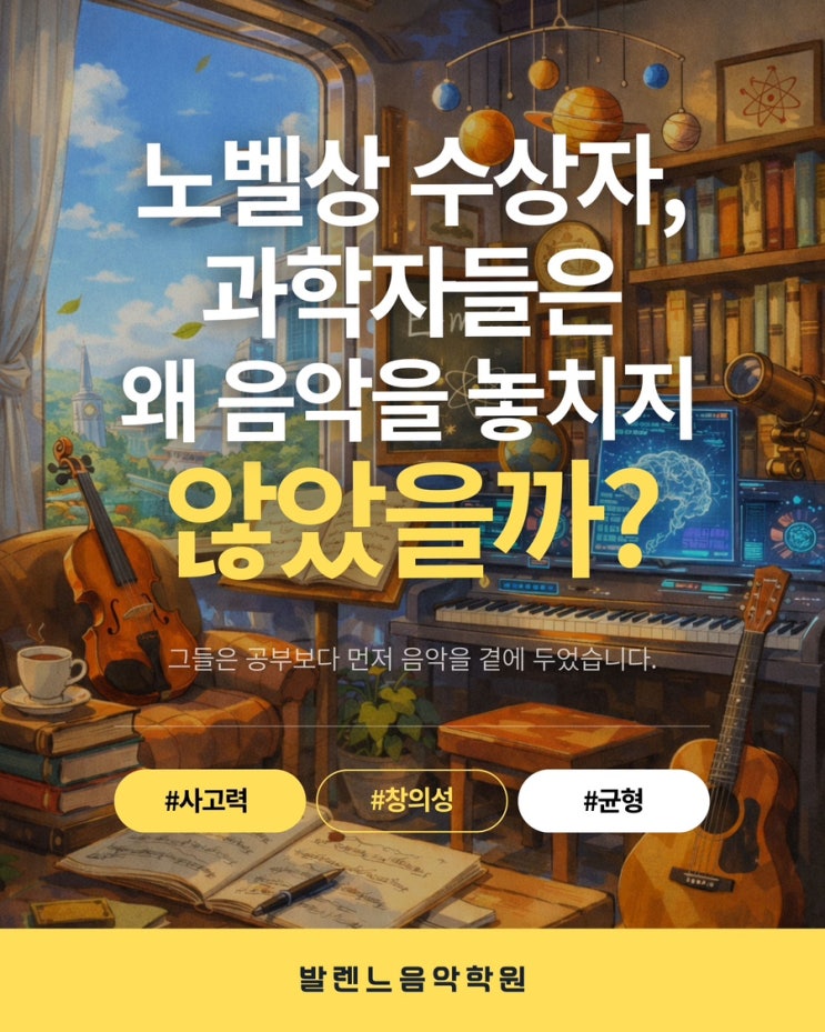 안녕하세요, 아이들의 사고력이 자라나는 곳, 김포 운양동 발렌느음악학원입니다 왜 세계적인 과학자와 노벨상 수상자들은 바쁜 연구 속에서도 평생 음악을 곁에 두었을까요? 오늘은 단순한 악기 연주를 넘어, 우리 아이의 '생각하는 힘'을 키워주는 음악 교육의 본질에 대해 이야기해보려 합니다. [천재들의 휴식엔 항상 '음악'이 있었습니다] 상대성 이론으로 유명한 알베르트 아인슈타인은 "인생의 기쁨 대부분은 음악에서 왔다"고 말하며 연구가 막힐 때마다 바이올린을 켰습니다. 양자역학의 아버지 막스 플랑크 역시 음악가를 꿈꿨을 만큼 깊이 있게 음악을 공부했죠. 그들에게 음악은 단순한 취미가 아....... <img src="https://blogthumb.pstatic.net/MjAyNjAzMTBfODgg/MDAxNzczMTQ3MDQ4MTE3.hRz_dpUUuc7C5O4an-mNi2kKHupbSQ1126TxY7sYE4wg.KypGqRvKAlgKh_yOjy3i0e-qdwI3-ZviDWw-fn10Dm4g.JPEG/IMG%A3%DF7023.JPG?type=s3" />