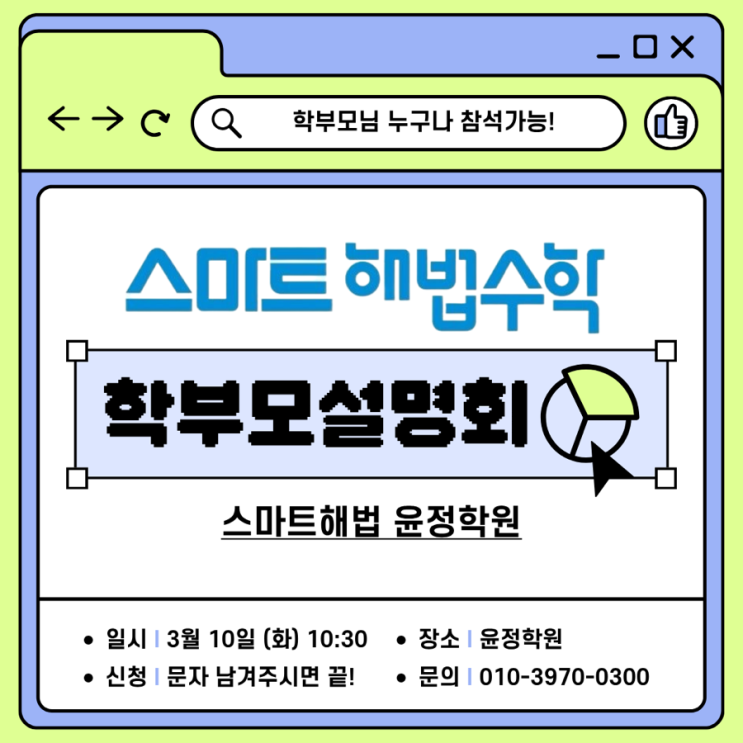 안녕하세요 스마트윤정쌤입니다! 다가오는 새학기, 우리 아이들의 수학 교육 어떻게 해야할지 고민이시죠 ? 학부모님들께서 가장 많이 하시는 말씀이 있습니다. ✔ 집에서는 푸는 것 같은데 시험 점수는 안 나와요 ✔ 문제는 많이 푸는데 응용문제를 못 풀어요 ✔ 중학교 올라가면 수학이 더 어렵다는데 걱정이에요 수학은 ‘양’이 아니라 ‘방법’의 차이입니다. 그래서 준비했습니다. 스마트해법 수학 학부모 설명회 날짜 : 3월 10일 (화요일) ⏰ 시간 : 10시 30분 장소 : 스마트해법 윤정학원 접수 : 010-8373-7157 성함과 학년만 문자로 남겨주시면 사전예약이 완료됩니다. ※ 좌석이 한정되어 있습니다. 우리 아....... <img src="https://blogthumb.pstatic.net/MjAyNjAyMjVfMTI0/MDAxNzcyMDIxMTQ1Mzgx.HJA0FgjkhnwhQ1NLFPm-9RiFP3XRfI-oAZ0Lq51Qkbsg.eTP4MPzD3mr0gb6OF-oqMf2sqTbGssOvCL9hbXqNjmYg.PNG/IMG%A3%DF3682.PNG?type=s3" />
