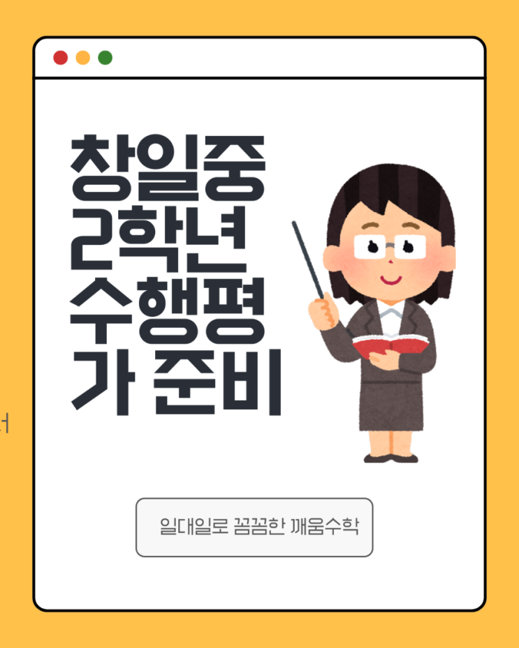 안녕하세요, 깨움수학입니다 이번 주에는 창일중 2학년 학생들의 수학 수행평가가 진행됩니다. 이번 수행평가 범위는 유한소수와 순환소수 단항식의 계산 다항식의 계산 입니다. 시험과 달리 수행평가는 풀이 과정과 이해도까지 평가되는 중요한 시험이기 때문에, 준비 방향이 매우 중요합니다. 중학교 수학 수행평가는 단순한 시험이 아니라 학생의 수학 실력과 학습 태도를 종합적으로 평가하는 중요한 요소입니다. 왜 중요한지 핵심만 정리해 드릴게요. 1. 내신 성적에 큰 영향을 줍니다 수행평가는 보통 20~30% 내외의 비중을 차지합니다. 즉, 지필고사를 잘 봐도 수행평가 점수가 낮으면 전체 성적이 크게 떨어질 수 있....... <img src="https://blogthumb.pstatic.net/MjAyNjA0MDFfMjY2/MDAxNzc1MDUxNzQyMzE1.LmobAfsc0Z0pIFupk7jLyfKpznu-aUOEHMbn8LlIdpYg.m-cvY-DuBhwE1bxsA7xvaiT7Hf5aA2am7_4lrWBy17sg.PNG/900%A3%DF2%A3%DF20260401%A3%DF225518%A3%DF0001.png?type=s3" />
