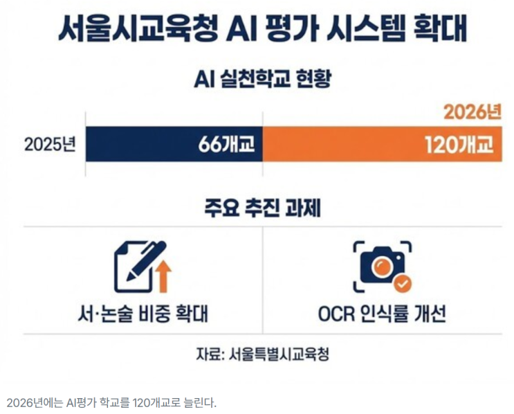 1. 변화의 시작: 왜 단순 암기만으로는 부족한가? 2026년부터 서울과 경기도를 중심으로 우리 교실의 평가 패러다임이 전면 개편됩니다. 과거의 평가가 정답 하나를 골라내는 '결과 중심의 상대평가'였다면, 이제는 학생이 결론에 도달하기까지의 '사고 과정'을 다각도로 분석하는 미래형 평가 체제로 진입합니다. 서울시교육청의 가이드라인에 따르면 서·논술형 평가 비중은 30% 이상, 수행평가는 40% 이상으로 권장됩니다. 특히 주목해야 할 지점은 학기별 2과목 이상 지정되는 '학생평가 선도과목'입니다. 이들 과목은 수행평가 비중이 최대 70%까지 확대되어, 단순 암기식 공부만으로는 성적 유지가 불가능한....... <img src="https://blogthumb.pstatic.net/MjAyNjAyMjFfMTk4/MDAxNzcxNjM5NDE2ODQw.rrlAaNhq1FMPD_cCukTAc0xmSYKOs8R197qeVMkQy4Ug.3cYtGGhb6za-rSJU9a-_HY0fHb_r0D71l6RDea4xU34g.PNG/image.png?type=s3" />