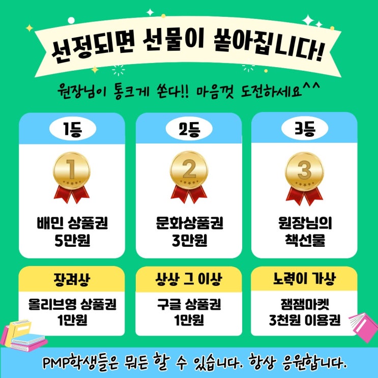 안녕하세요 ^^ PMP학원 입니다. 배움의 깊이는 결국 생각의 깊이에서 시작됩니다. 우리 PMP학원에서는 아이들이 스스로 읽고, 생각하고, 표현하는 힘을 기를 수 있도록 특별한 독서 이벤트를 준비했습니다. 곧 개학이 다가 오지만 남은 방학동안 우리 학생들 책 한 권 읽히고 싶어서요 ^^ 공부, 친구관계, 미래에 대한 걱정 등 여러가지 어려움을 겪을 시기이지요. 때론 누군가의 말보다 책에서 읽은 한 구절을 통해서 감동과 큰 깨달음을 얻기도 하는 것 같습니다. 이번 기회에 우리 아이들이 좋은 책을 만나서 위로를 받고 읽는 기쁨을 알게 됐으면 하는 바람입니다. 작은 습관이 큰 실력을 만듭니다. 이번 독서 이벤트가 아이들에게 의미 있는....... <img src="https://blogthumb.pstatic.net/MjAyNjAyMjRfMTQ5/MDAxNzcxOTMxNDk5NDcx.OUfUYKXOS5u_wk9nJ0wEwuYybbrvQe2p8ajEitBMf6sg.hEWzrMOWYJgJaPSZ38uxEDjwVd659oV3Qv-npnNMWWEg.JPEG/KakaoTalk_20260224_200404642.jpg?type=s3" />