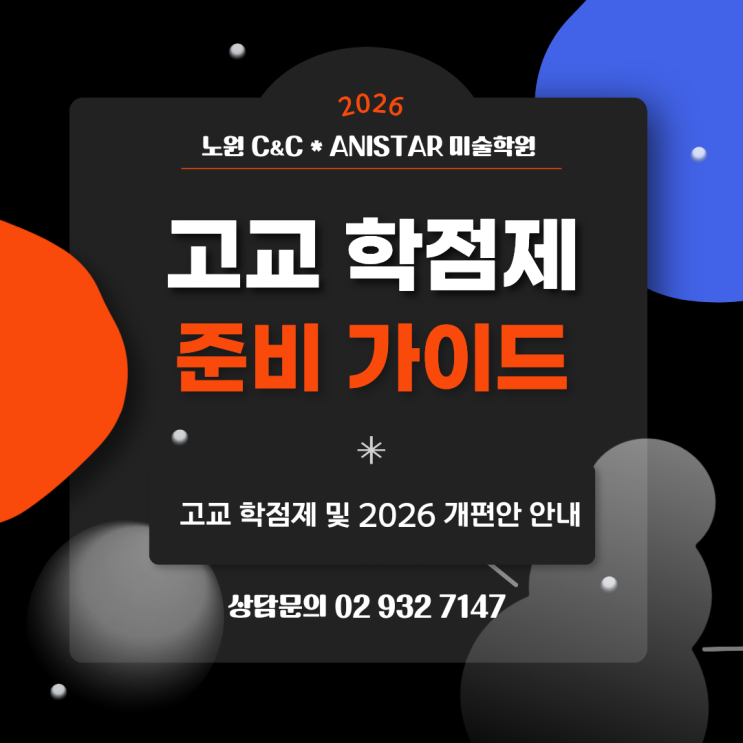 안녕하세요~ 노원 씨앤씨 * 애니스타 미술학원입니다 오늘은 2026년도 고교 학점제 개편안 및 고교학점제 안내해드리려고 찾아왔어요! 지금 현 고등학교 2학년 학생들 대상으로 시작되는 고교학점제, 어려운점이 많으시고 헷갈리는 부분들이 있을꺼라 생각됩니다. 저희 씨앤씨 미술학원은 한 발 앞서나가서 항상 공부하고 연구하고 있습니다. 궁금하신 사항이 있으시면 언제든지 방문하셔서 상담하시면 친절하게 알려드리도록 하겠습니다 * 고교 학점제는 2025년부터 전면 시행되었으며 총 192학점을 이수해야 졸업할 수 있습니다. 정해진 시간표가 있는 것이 아닌 대학교처럼 학생들이 직접 수강신청을 하면 됩니다. 학생의 선택 중심의 교....... <img src="https://blogthumb.pstatic.net/MjAyNjAyMTlfMjYx/MDAxNzcxNDgxNDM0OTc0.tYvdyi2VxNKxwQPBoPPpBKbV7o2b5oY8xlfNbzTgoMAg.DeBCEDv6SCy4nXQd5JaHiuCkYWYQvoB5iNfyRcnqqFEg.PNG/1.png?type=s3" />