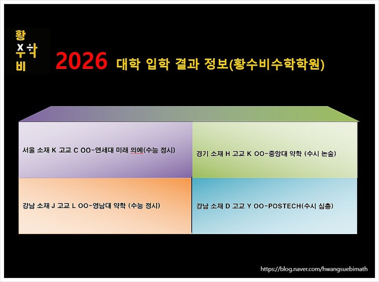 대학 입시 결과 산출 기간 및 근거 1.2025~2026 학년도 국내 대학 입시 결과만 산출 2. 재원 기간이 최소 1년 이상인 경우만 표본으로 산출함. 대학 입학 결과 정보 2025학년도 대학 입학 정보 강남 소재 D 고교 L OO -서울대 건축 (수능 정시) 강남 소재 D 고교 L OO -연세대 기계공학 (수능 정시) 강남 소재 E 여고 K OO -서울대 의대 & 한양대 의대 동시 합격(수능 정시) 강남 소재 J 고교 J OO -고려대 시스템 의학(수리논술) 2026학년도 대학 입학 정보 서울 소재 K 고교 C OO-연세대 미래 의예(수능 정시) 경기 소재 H 고교 K OO-중앙대 약학 (수시 논술) 강남 소재 J 고교 L OO-영남대 약학 (수능 정시) 강남 소재 D 고교 Y OO-POSTEC....... <img src="https://blogthumb.pstatic.net/MjAyNjAyMjNfMjMy/MDAxNzcxODMxOTM4Mzcy.wLjr0ncXng65LZdOzwvNc-aMdbwe5VGeE7fsqIcGLucg.BockfLlh27npguoKW-h0uBdNdlvQK1rBtej5nKuw8gkg.JPEG/26%C0%D4%B0%E1.jpg?type=s3" />