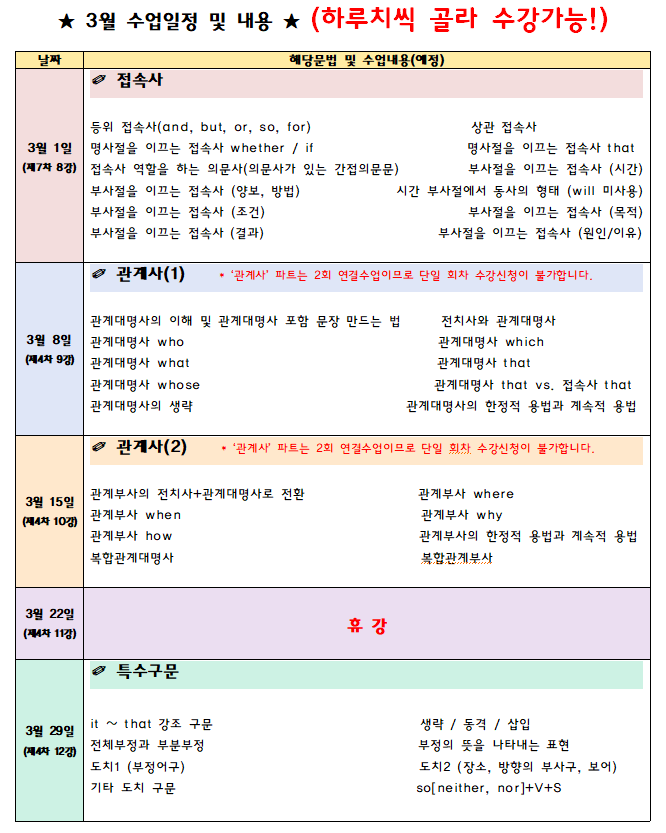 안녕하세요 진심영어학원입니다! 2월에 이어 너무 인기가 많아 돌아온 진심영어 문법 특강 원데이클래스! 3월 1일 개강 오픈 안내드립니다. 영어 학원을 오랜 시간 다녔지만 문법을 정확히 알지 못하고, 각종 시험과 독해, 영작 등 어려움을 겪어 성적에 난관을 겪은 경우를 많이 보았습니다. 우리 학생들의 하루 스케줄에 부담이 없고, 원하는 수업을 골라들을 수 있는 진심영어 인기 수업, 원데이클래스 어떤 학생이 들으면 좋을까요? 문법이 자신이 없다! 독해와 영작 서술이 막막하다! 문법이 너무 어렵다! 수업 이후 응용이 힘들다! 특정 문법 이해가 힘들다! ... 3월 1일부터 한 달간 진행되는 프로그램으로 2026년 문법을 완벽히 습득할 수....... <img src="https://blogthumb.pstatic.net/MjAyNjAyMjVfMTk1/MDAxNzcyMDIxNDY2MzE4.MBPD-w4VRy7ofUYByMJPWOu6hznMFGXVCIbu4nAtCjgg.n8h7xPSgzMNTSx8iGKDoSZ6FbsGEVa5kEEgGujlsS0Ag.PNG/image.png?type=s3" />