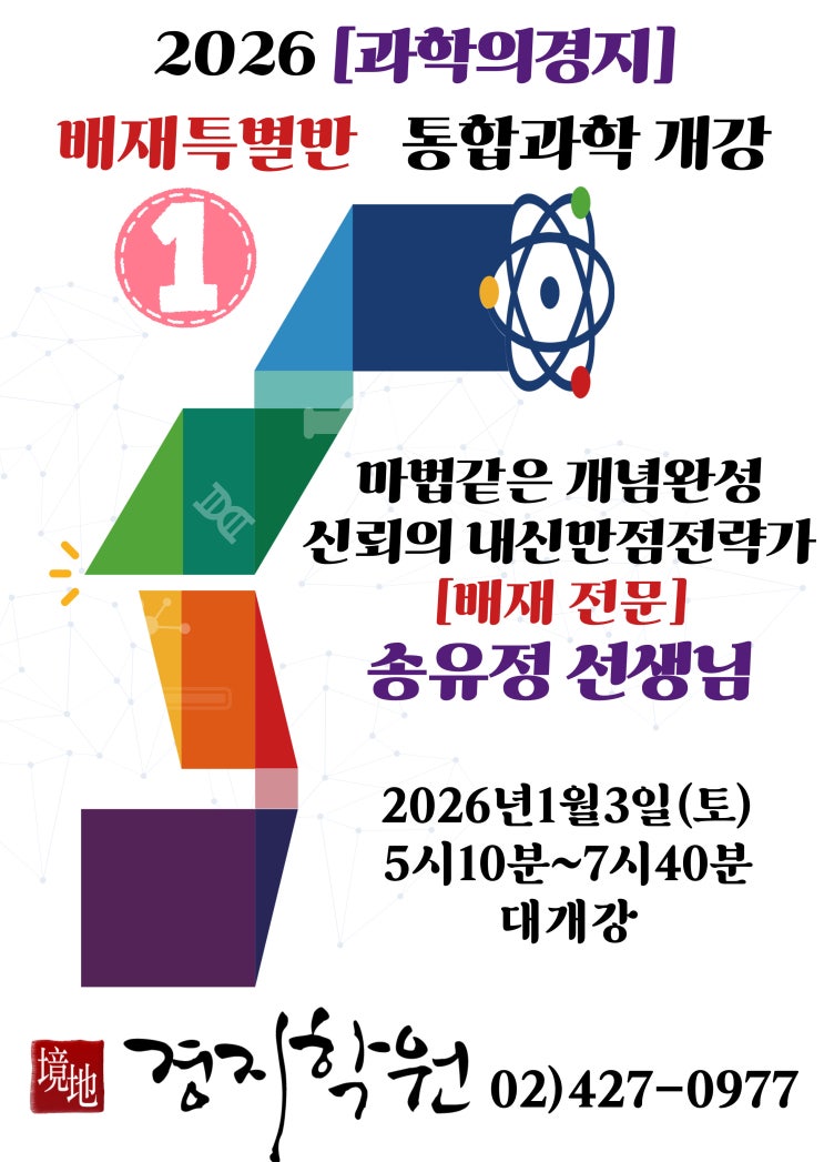 2026년 144기 배재고 합격을 진심으로 축하드립니다 ~^^ 배재고 학생들의 "통합과학 1등급 목표" 수업 시간 2026년 1월2일 (금) 6:30~9:30 2026년 1월3일 (토) 5:10~7:40 2026년 1월4일 (일) 5:10~7:40 순차적 개강 " 배재고 통합과학은 언제나 <송유정> " *송유정 통합과학이 다른이유 1. 잘가르친다가 아니라 [배재고 내신]에서 무너지는 지점을 정확히 알고 준비합니다 2. 배재고 내신을 연구하고 만들어온 강사진으로 구성된 과학팀입니다 3. 개념 → 적용 → 테스트까지 한번에 문제로 확인하고 점수로 연결합니다 4. 매년 업데이트 되는 자체교재(배재 내신,모의고사 기출분석)로 단순설명이 아닌 시험형 교재로....... <img src="https://blogthumb.pstatic.net/MjAyNTEyMjhfNTEg/MDAxNzY2OTAwMzQyNjY1.P16EnHllnhIQazU6yqsMx09vPNSoXDPk4poQbXtfCJ0g.gWxY8sYuzJA5qQr3fNiYlGM7-VeFiLy6VQ5mNB84sdAg.JPEG/%B9%E8%C0%E7%C0%FC%B9%AE-001.jpg?type=s3" />