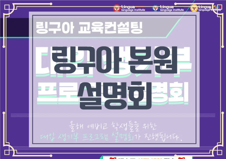 대입 생기부 프로그램 설명회 안녕하세요, 링구아교육입니다. 2025년 고등학교 입학을 앞둔 예비고 학생 여러분과 학부모님들께 중요한 소식을 전해드립니다. 고교 입학과 동시에 시작되는 대입 준비, 그 핵심인 생활기록부 관리 전략을 제시하는 설명회를 개최합니다. 학교생활기록부 생기부 관련 설명회 일시 | 2025년 1월 31일(토) 오후 3시 장소 | 링구아교육 본원 대강당 대상 | 예비고(특목·자사고·일반고) 학생 및 학부모 이런 분들께 꼭 필요합니다 고교 입학 후 생기부 관리 막막하신 분 명문대 합격 생기부의 실제 사례가 궁금하신 분 고교학점제 시대, 진로·전공 연계 학습 전략이 필요하신 분 2028학년도 대입 개편에 대비하고 싶으....... <img src="https://blogthumb.pstatic.net/MjAyNjAxMjlfMTc1/MDAxNzY5NjYyMjQ1MjY0.Eqnluvm1enVh_JhWIQ2BWLXL_NxheS6MpPIx-yA44AAg.mjphBsgFKsEj2fgMTxVeFYmCTCrvX78Aa4NoEZYHucMg.PNG/%B8%B5%B1%B8%BE%C6_%C0%FC%B1%B9%BA%BB%BF%F8_%BC%B3%B8%ED%C8%B8-001.png?type=s3" />