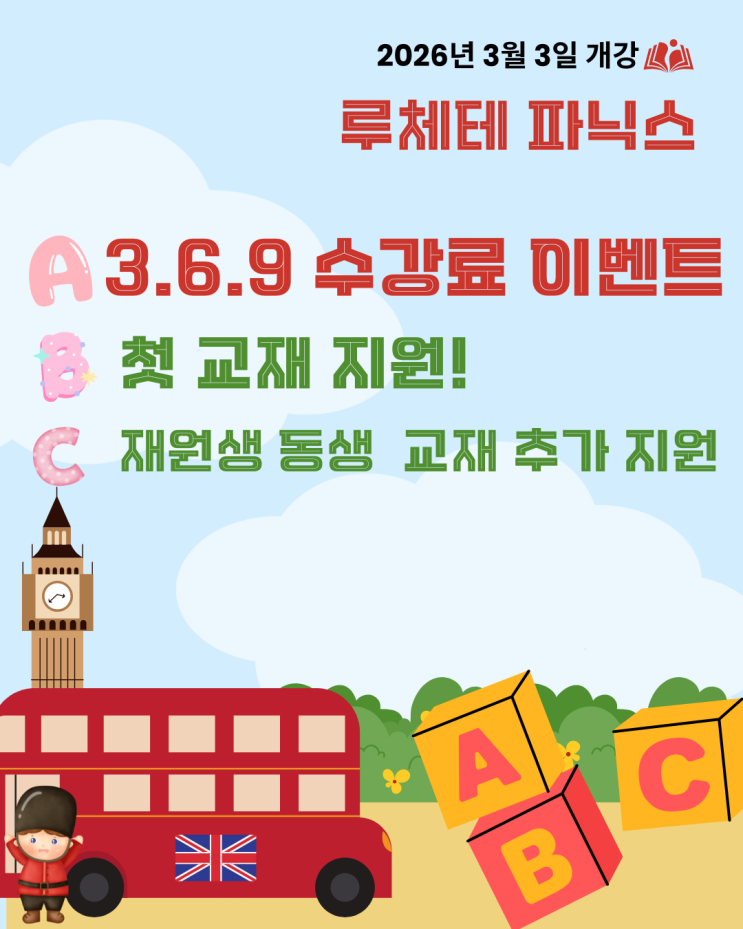 안녕하세요! 루체테어학원 동래수안캠퍼스입니다. 2026년 새학년 준비하며, 신규 파닉스 반 오픈과 함께 특별한 이벤트 소식을 전해드립니다. 2026년 3월 새학년을 여는 시작, 영어 처음이 중요합니다. 루체테에서 시작 해 봅시다. 3·6·9 BIG EVENT 안내 개강일: 3월 3일(화) 수업시간 : 2시 55분 ~ 4시 20분 접수 마감: 2월 27일(금)까지 등록 시에만 적용되며, 타 이벤트와 중복 적용되지 않습니다. ※ 정원 마감 시 조기 종료될 수 있습니다. 대상 : (예비) 초등1,2,3학년 이번 파닉스 신규 모집과 함께 3개월 동안 점점 커지는 장학 혜택을 준비했습니다. ✔ 3월 수강 시 수강료 30% 할인 혜택 ✔ 4월 수강 시 수강료 60% 할....... <img src="https://blogthumb.pstatic.net/MjAyNjAyMDJfNTcg/MDAxNzcwMDMxNzY4NDE0.jY6p4XbNiNi0nvGUYMmMQP33lhzeKBKD1idkfd0Tpu0g.Il2znz3NLTSe-U1Cr6Rtz9ZhTBB6wJjBJh8nz_t5fQsg.PNG/26%B3%E2%B5%B5_369_%C0%CC%BA%A5%C6%AE_%C6%C4%B4%D0%BD%BA_%281%29.png?type=s3" />
