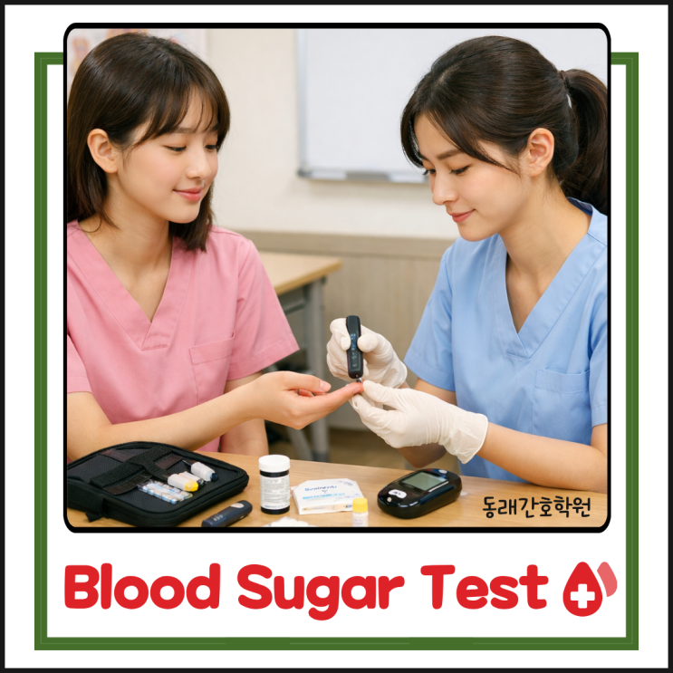 안녕하세요~ 부산 간호교육의 중심 동래간호학원입니다 벌써 2월이라니 정말 믿기지가 않네요~~ 다들 비슷한 마음이시죠? 동래간호학원 학생들은 다가오는 상반기 국가고시 준비로 그 어느 때보다 분주한 날들을 보내고 있는데요✍ 시험 준비하느라 몸도 마음도 지칠 수 있는 시기이지만 남은 시간 동안 컨디션 조절 잘 하시고 합격을 위해 모두~ 파이팅입니당! \(゚ー゚\) ( ノ ゚ー゚)ノ 오늘은 혈당검사에 대해 알아볼 텐데요! 요즘은 가정에서도 혈당 측정기를 구비해둘 만큼 대중적인 건강관리가 되었죠 우리 56기 야간반 학생들도 혈당 측정 수업을 배우기 위해 직접 팔을 걷어붙였는데요~⚕️ 환자의 상태를 읽....... <img src="https://blogthumb.pstatic.net/MjAyNjAyMDNfNjcg/MDAxNzcwMTE1MjU2NTI2.cEb8jC7TFphagpsQUQe7KUJi2ow4MH6o8cg3pkOpTCEg.MFc_uCQ5xzpfCKXjHMYdtlu3iND-97LVBxisIuBjGbAg.PNG/%C1%A6%B8%F1%C0%BB_%C0%D4%B7%C2%C7%D8%C1%D6%BC%BC%BF%E4._%288%29.png?type=s3" />