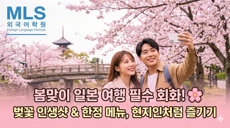 안녕하세요! MLS 외국어학원입니다. 부산 남구 대연동 MLS 외국어학원입니다. 날씨가 제법 포근해지면서 다가오는 3, 4월 일본 벚꽃여행을 계획하는 대학생, 직장인 분들이 정말 많으신데요! 여행의 설렘을 200%로 끌어올리려면 역시 현지에서 직접 써먹는 한마디가 필수겠죠? 小さな一歩が実力を変える。 "작은 한 걸음이 실력을 바꿉니다." "다가오는 일본 벚꽃 여행! 현지인처럼 말하며 즐기는 봄맞이 실전 일본어 회화” 오늘 포스팅 구성 벚꽃 명당에서 당당하게 사진 부탁하기 카페에서 '봄 한정판' 메뉴 주문하기 감동을 표현하는 꽃구경(하나미) 리액션 1. 벚꽃 명당에서 당당하게 사진 부탁하기....... <img src="https://blogthumb.pstatic.net/MjAyNjAyMjZfMTQ1/MDAxNzcyMTAzNjM1NDIy.JbQzq_QsoCcBQJVLzzyg_Hki1wpaEyT3N1p81czeOrEg.0xKAVQeBjoEbTVqXR-nluKambGmyRt3kg-70H3254r4g.PNG/image.png?type=s3" />