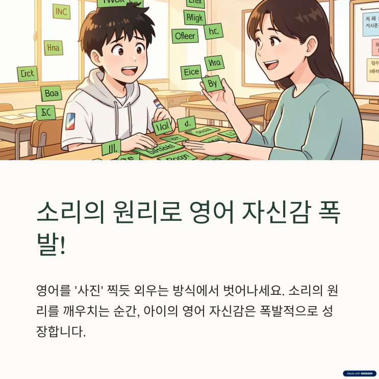 영어를 3년이나 배웠는데 왜 처음 보는 단어 앞에서 우리 아이는 입을 꾹 다물고만 있을까요? 혹시 우리 아이도 단어를 '소리'로 공부하는 게 아니라 글자 모양을 통째로 외우는 '사진 찍기' 중일지도 몰라요. 무려 80% 이상의 초등 저학년 아이들이 원리 없이 단순 시각 암기에만 의존한다는 사실, 알고 계셨나요? 솔직히 저도 처음엔 많이 놀랐는데, 이게 정말 위험해요. 오늘은 우리 아이 영어 실력을 근본적으로 바꾸는 '읽기의 본질'에 대해 진솔하게 이야기해 보려 합니다. 'Memory Load'가 아이의 성장을 가로막는 이유 단어를 무작정 외우는 건 마치 모래 위에 집을 짓는 것과 같아서 금방....... <img src="https://blogthumb.pstatic.net/MjAyNjAyMTJfMTEy/MDAxNzcwODk2MjAxMTMx.Cp79W3q0PYXaOQhobJSX0osCkHcCYvwvWtU-Yahjq4Eg.B5Jew3uMlNwpYXoXeYNsq8-FLIKn0qthTMPKk8PFK54g.PNG/1_.png?type=s3" />