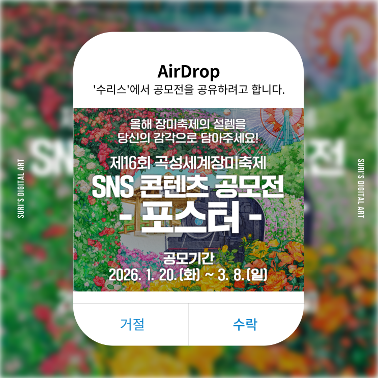 안녕하세요, 수리스의 밍니입니다 :) 오늘 소개드릴 공모전은 '제16회 곡성세계장미축제 SNS 콘텐츠(포스터) 공모전'입니다. 공모전 소식을 보니까 5월에 열리는 곡성장미축제에 저도 꼭 한번 가고 싶네요 :) 주제 열여섯, 장미사춘기-설렘·성장·변화 공모기간 2026. 1. 20. (화) ~ 2026. 3. 8. (일) 참여대상 전국민 누구나 참여방법 - 포스터 이미지와 Ai파일 혹은 Ai 변환 가능한 원본 제출 - 이메일 제출 : 담당자 e-mail sangyu100@korea.kr - 메일제목 : [공모분야]_제16회 곡성세계장미축제 SNS 콘텐츠 공모전_성명 예)[포스터]_제16회 곡성세계장미축제 SNS 콘텐츠 공모전_홍길동 - 1인당 2점 작품 수(최대)로 제한 ※ 중복수....... <img src="https://blogthumb.pstatic.net/MjAyNjAyMjBfMjA1/MDAxNzcxNTcyMTQxOTM1.E7ueCopLPcFP6BuVu5R_bI5c0QHLsodlRsDIaPt2aZwg.Xftg136OCRdR3lXoBZ99Ah2SHKhCOnEZqYNkx-xPNzUg.PNG/%B0%F8%B8%F0%C0%FC-001_%2844%29.png?type=s3" />