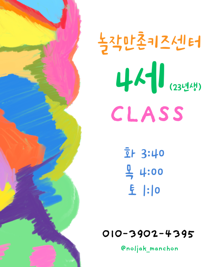 안녕하세요 이제 4살이 된 아이들은 결과 중심의 미술활동보다는 재료를 충분히 탐색하고, 오감을 통해 경험하는 놀이 중심 미술활동이 더욱 중요 한대요^^ 다양한 감각 자극 속에서 스스로 만지고, 느끼고, 표현해보는 과정이 아이들의 사고력과 표현력을 자연스럽게 키워줘요! 놀작 만촌 키즈센터의 4세 미술수업은 재료를 자유롭게 탐색하며 오감을 자극하고, 자발적인 놀이 활동을 통해 생각을 확장하며, 자신의 감각적 경험을 언어로 표현해보는 감각적 언어자극 놀이 수업으로 진행되고 있답니다~ 놀이처럼 즐겁게 참여하면서도 아이의 감각, 생각, 표현력이 함께 자라는 수업입니다 ✨ 아이들은 감각을 통해 세상을 배워가요 보....... <img src="https://blogthumb.pstatic.net/MjAyNjAyMjVfMTY3/MDAxNzcxOTkwMzE5ODQ2.teNqEH3KpRjZGby2zmFFOrsUZYR2obv003zr8vYFJScg.ZsBxHwMSu2MXQtmKiv0w8aevoQMXveFHWMF6dkVD4Qwg.PNG/KakaoTalk_20260225_121309211.png?type=s3" />