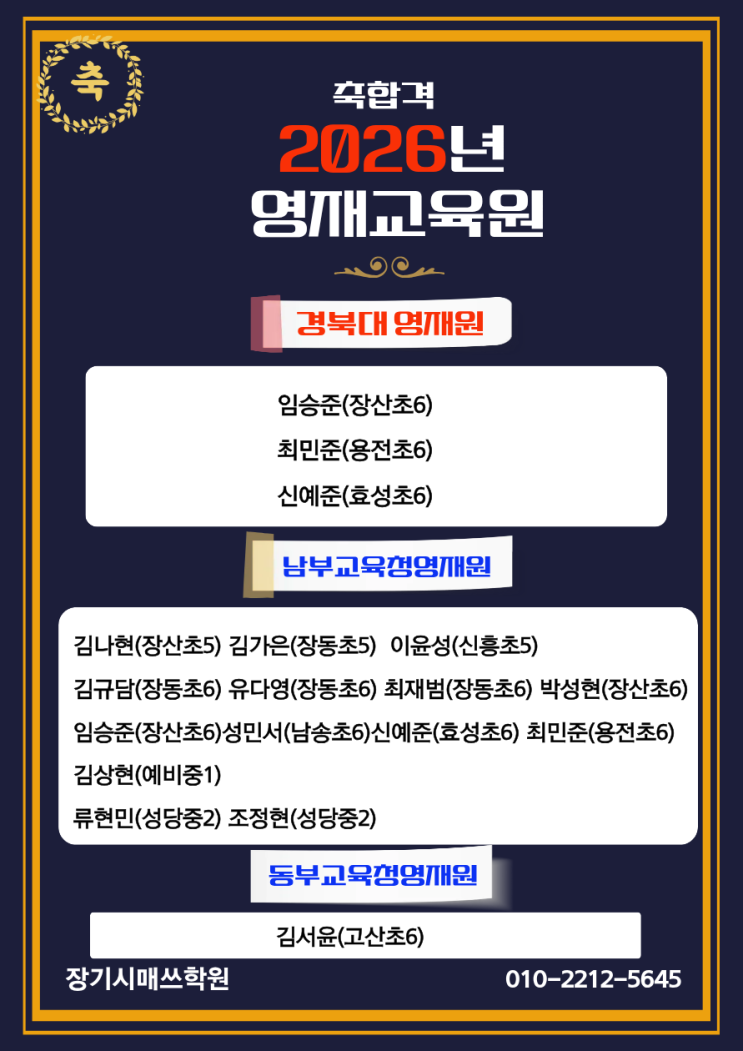 #경북대영재교육원#남부교육청영재원#동부교육청 영재원#대구교대영재원#장기시매쓰#기프티드반#심화사고력 안녕하세요. 장기시매쓰학원입니다. 지난주 토요일 마지막으로 대학 영재원 및 교육청 영재원 합격자 발표가 모두 마무리되었습니다. 장기시매쓰학원 학생들 중 경북대학교 영재원 3명 합격 교육청 영재원 15명 합격 이라는 기쁜 소식을 전하게 되었습니다. 이번 도전에서 아쉽게도 최종 합격 소식을 전하지 못한 친구들도 있었지만 영재교육원 준비과정에서 "합격, 불합격" 여부를 떠나 영재원 준비 과정 자체가 초. 중등 과정에서 좋은 경험이 되어 값진 성장의 기회가 될 것이며 지금 당장의 눈앞에 성과보다는 학교 교과과....... <img src="https://blogthumb.pstatic.net/MjAyNjAxMDVfNiAg/MDAxNzY3NTg2NzEyMzI3.veGRIkX1ERZ_ngzgZ71_j1IpJJrSXhBd0Rpu44HC1EIg.zJy25aWv8hQ5uZy9hNLcyKt_qwR7YNXfag6EQHxEWpkg.PNG/2026%B3%E2_%BF%B5%C0%E7%BF%F8%C7%D5%B0%DD.png?type=s3" />