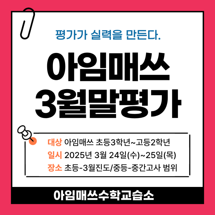 안녕하세요. 아임매쓰수학입니다. 3월 월말평가 안내 & 왜 중요할까요? 새학기의 시작과 함께 아임매쓰수학에서는 학습의 방향을 점검하고 실력을 확인하는 3월 월말평가를 진행합니다. ♣ 3월 월말평가 일정 ∨시험일: 3월 25일(수) ~ 3월 26일(목) ∨시험범위: ∨초등부: 3월 학습 진도 전 범위 ∨중·고등부: 1학기 중간고사 시험 범위 기준 ✔️ 왜 매달 월말평가를 실시할까요? 단순한 시험이 아닙니다. 월말평가는 학생의 성장을 만드는 핵심 시스템입니다. 1. 학습의 방향을 바로잡는 기준점 공부를 하다 보면 “잘 하고 있는지”를 확인하기 어렵습니다. 월말평가는 ✔ 현재 위치를 정확히 확인하고 ✔ 부족한 단원을 즉시 보완할 수....... <img src="https://blogthumb.pstatic.net/MjAyNjAzMjFfMjI3/MDAxNzc0MDMxOTkxMTAw.-_82N_9RR0Gj49g_A65EVPkEeHoSSx5uYkuBlyGPMB8g.HnTzGMui3tw7nN-Up5iZGXrkBKVTNA4bwxHk1iInb5Eg.PNG/3%BF%F9%B8%BB%C6%F2%B0%A1.png?type=s3" />