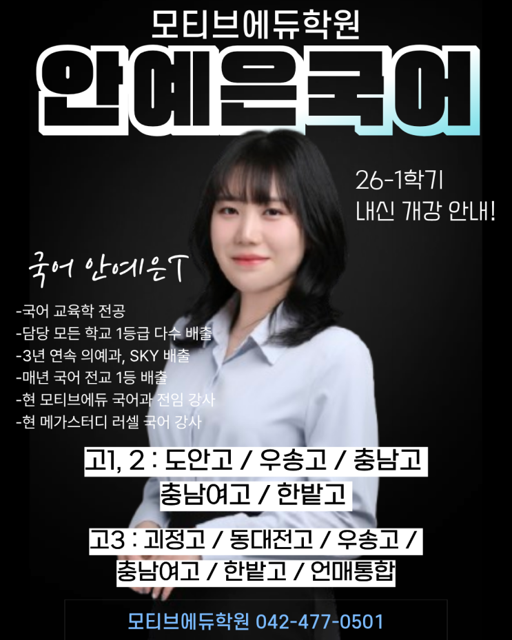 [제 서 5296호] 둔산동 국어 / 영어 / 수학 / 과학 / 사회 상위권이 선택한 내신&수능 전문 모티브에듀학원 안녕하세요, 모티브에듀학원입니다:) 오늘은 고등부 국어과 안예은T의 26-1학기 내신 시간표를 안내 드리고자 합니다! 3년 연속 의예과 및 SKY 배출, 담당 모든 학교 1등급 다수 배출, 매 년 국어 전교 1등 배출을 해주시는 저희 예은쌤의 내신 수업, 그 비결이 궁금하지 않으신가요? 어느 학생도 빠트리지 않고, 누구나 다 하는 공부만으로는 1등급을 받기는 어렵습니다. 학교마다 시험 범위, 출제 난이도, 외부지문 활용 범위, 문항수, 배점 구조 등이 너무나도 다르기에 학교별 맞춤 자체교재를 활용한 학교별 내신 수업은 특히나....... <img src="https://blogthumb.pstatic.net/MjAyNjAzMjNfMTA3/MDAxNzc0MjUwNDg5OTU1.K4dZA8gFYD2XgCtMp0nYS0wP6cH2bQQa1lDdNQ1NTUAg.gdrW6p5UpxhNQgM1Deaccr6nuj-fw-fpb6uH90Axwfsg.PNG/1.png?type=s3" />
