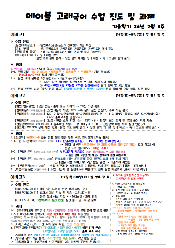 안녕하세요. 우뚝 국어학원입니다. 어느덧 2월도 중순을 향해 가고 있습니다. 긴 겨울방학이 끝나고 새 학년 개학이 얼마 남지 않았다는 사실에 학생도, 학부모님도 설렘보다는 긴장감이 더 커지는 시기입니다. 오늘은 다가오는 3월을 앞두고, 우리 학생들이 1학기 내신에서 우위를 점하기 위해 지금 반드시 챙겨야 할 전략과 현실적인 학원 선택 팁을 전해드리고자 합니다. 1. 지금은 '기본기'가 아닌 '실전 내신'을 선행할 때입니다. 겨울방학 초반이 국어의 전반적인 체력을 기르는 시기였다면, 개학을 목전에 둔 지금은 철저하게 '1학기 중간고사'를 겨냥한 학습으로 태세를 전환해야 합니다. 고등 내신은 학.......