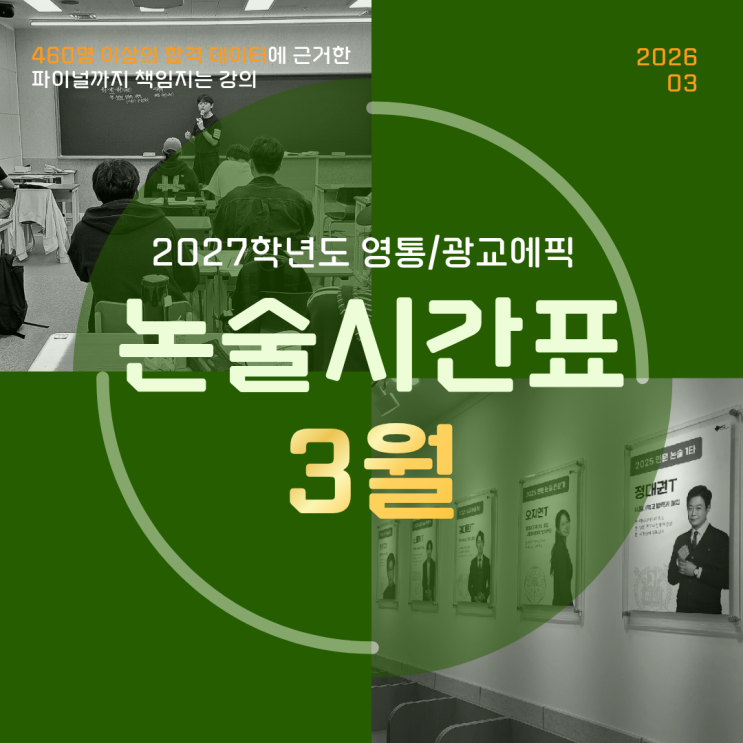 3월 인문/ 수리 논술 신규개강반 확정 - 2026학년도 에픽X시대원 460명 대학 합격생 배출 (논술, 학종, 교과) - 논술 재원생 기숙학교 ‘등원/귀교‘ 버스 지원 : 화성고, 병점고, 세마고, 가온고, 수원외고 - 수많은 합격 경험과 노하우에 기반한 차별화된 1:1 대면첨삭 / 전국유일 학원자체 모의논술고사 실시 / 모든 수강생 1:1 입시 상담 - 진행중인 반에 신규로 등록하더라도 논술 수업 문제 없이 진행 가능합니다. (선생님들의 개인별 지도 및 보충자료 무한제공) ※원하시는 지점, 강사와 시간표를 미리 확인하신 후에 수강신청 부탁드립니다. ※ 응답순으로 등록안내 문자 메시지를 보내드립니다. ※ 예약 확인 문자는 1~3일 소요될 수 있....... <img src="https://blogthumb.pstatic.net/MjAyNjAyMTdfNzQg/MDAxNzcxMzI0MzgwMDM4.JjTLV5Jcbf0Z0Y4Am1f8QZHOtalmSoU_-9wDUl0RRH4g.sjjLu8VOr3vd_4xUjfvPffxYeOtShQ4WvMmGXH3yy_Ig.PNG/%C1%A6%B8%F1%C0%BB_%C0%D4%B7%C2%C7%D8%C1%D6%BC%BC%BF%E4._%2828%29.png?type=s3" />