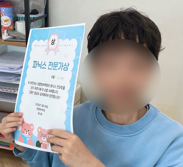 우리 아이들이 하는 말입니다 ㅎㅎ 작년 1월부터 시작했던 파닉스 과정이 모두 끝나고 드디어 파닉스를 졸업(?) 했네요. 스마트파닉스 교재 5권을 마쳐 수료증 개념의 상장을 주었습니다. 아이들은 이제 알파벳의 소리만 듣고도 철자를 조합하여 단어를 쓸 수 있답니다. 물론, 파닉스 규칙에 맞지 않는 단어도 있지만 규칙을 적용한 모든 단어는 읽고 쓰고 합니다. 단어는 문장을 이루는 매우 기초적인 것이므로 소리로 저장된 단어는 문장을 읽어나가고 나아가 내용을 이해하는데 기본 바탕이 됩니다. 단어를 암기하는게 아니라 소리와 연결지어 학습한 아이들은 문장도 단어도 척척 써나갈 수 있습니다. 그래서 파닉스 학습이 중요하지요.^^ 이....... <img src="https://blogthumb.pstatic.net/MjAyNjAyMjFfMjYz/MDAxNzcxNjM2NzEzNzg3.6z61KXj6HzyeXAKkmPCDme2teeVUlRi0adYdXjXcWd4g.B8f8Su-XiykWHZqs-kXWJUoM4Ty8zuOSRPwN6eOh6r0g.JPEG/output%A3%DF4123659554.jpg?type=s3" />