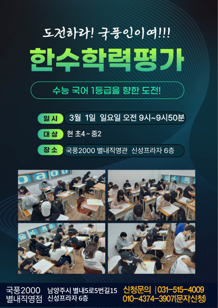 안녕하세요. 성적향상의 바이블! 수능·내신·학종의 삼위일체 학습법 별내 국어학원 국풍2000 별내직영관입니다. 국어 실력은 막연한 느낌이 아니라, 객관적인 진단에서 시작됩니다. 국풍2000 국어전문학원에서는 초등 고학년부터 중등까지 전국 단위로 비교 가능한 한수학력평가를 매월 마지막 주 실시합니다. 대상: 초4 ~ 중2 일시: 3/1(일) AM 09:00 (10분 전 입실) “재원생은 매월 필수 응시를 통해 실력을 관리합니다.” “공부 잘하고 있어요.”라는 말만 믿고 계시진 않으신가요? 전국 기준에서 우리 아이의 위치는 어디일까요? 전국 단위 비교 평가로 우리 아이의 정확한 위치 점검이 가능합니다. 매달 한 번, 국어 실력을 점검하고 수능....... <img src="https://blogthumb.pstatic.net/MjAyNjAyMjFfNTAg/MDAxNzcxNjU1NjQxOTY1.93rOavDIfjP25LMpvDkRZBB0T2KhUUcFoQnDmw0hb28g.oNPUBgWDlXJ1JO0iLjIIJF-P94UF_ndLYE0zEjADaKUg.PNG/2.png?type=s3" />