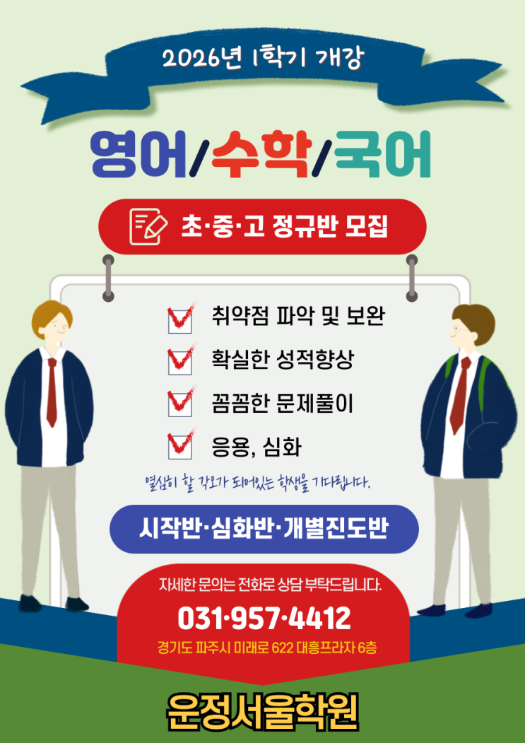 운정서울학원 초/중/고 영어 & 수학 & 국어 2026년 1학기 개강 안내!!