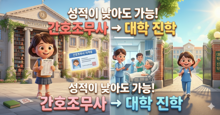 간호조무사 자격증 자체가 “가산점”으로 직접 반영되는 경우는 흔치 않지만, 현실적으로는 이렇게 쓰입니다. 성인학습자/만학도 전형: 나이·경력 기반 전형이라 내신/수능 부담이 상대적으로 낮은 편 재직자 전형(특성화고졸 재직자 등): 산업체 재직 + 일정 경력을 충족하면 “정원외”로 선발 전공 선택에서 강점: 보건계열(보건행정/사회복지/상담/스마트팜·바이오 등)에서 자기소개·면접 스토리가 강해짐 대학 진학 후 루트 확장: 학사학위→(편입/대학원/보건직무 확장)까지 설계 가능 목표 지역(평택·안성·천안·아산) 성인학습자/재직자 전형 대학 리스트 (학교별 표) 표의 “전형/지원자격/서류/반영”은 모집요강에 명시된 핵심만 뽑았....... <img src="https://blogthumb.pstatic.net/MjAyNjAxMDNfMjky/MDAxNzY3NDM1MzQ1NTM2.zbEE5i9NJdF78ZC6Y6bSNogltSx6cQZBB0UWaTiiAwog.togNNj7nodu_N1aypmLRivsXhl2Lm_RvEiXM3H0-7DIg.PNG/Gemini_Generated_Image_mwm2bhmwm2bhmwm2.png?type=s3" />