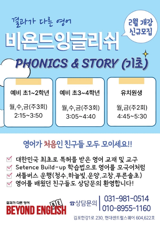 안녕하세요. 비욘드 잉글리쉬 운양 캠퍼스 입니다. 새학기를 맞아 파닉스&스토리 신규반을 모집합니다. 수업 시작은 2월부터이며, 유치원생/예비초1~2/예비초3~4 로 나누어서 반이 편성될 예정입니다. 파닉스 말고도 기존에 영어를 배웠던 친구들도 언제든지 상담 문의 환영입니다. 많은 관심 부탁 드려요 <img src="https://blogthumb.pstatic.net/MjAyNjAxMTZfMTUw/MDAxNzY4NTUxODQyMTkx.vSPBNQ73XqUEEUUqDaDGtlZBdnfW6r9PhiHE4xcgKScg.HfuVR0cuagKYDiUzZ7iIDpAoJDmMmseqT4Iky33dXuAg.JPEG/2026%BD%C5%C0%D4%BB%FD%B8%F0%C1%FD.jpg?type=s3" />