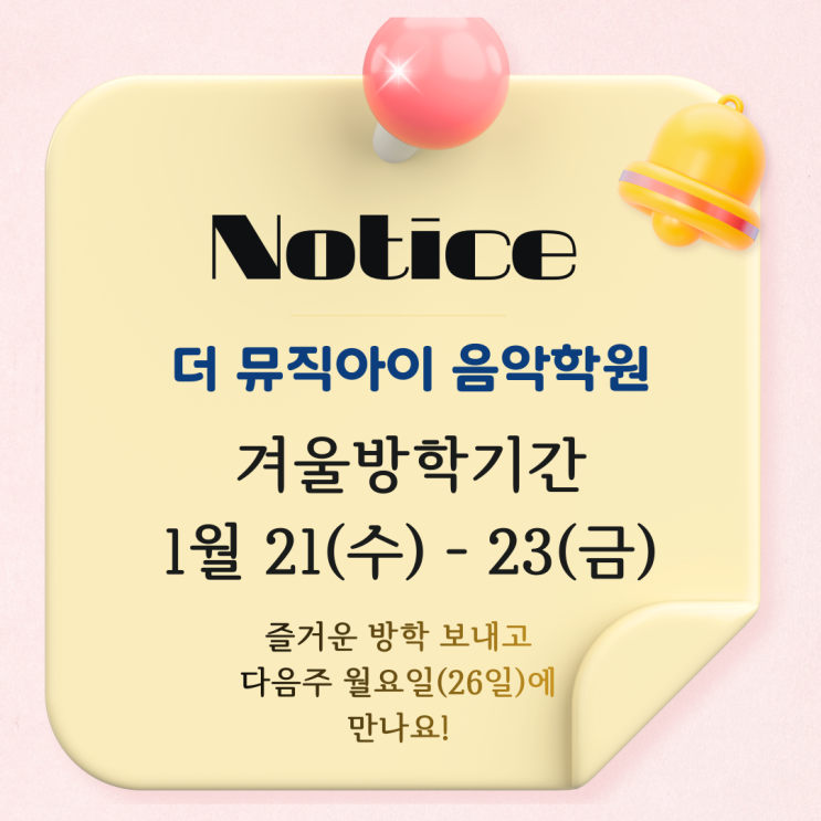 안녕하세요, 더 뮤직아이 음악학원입니다! 다가오는 새 학기를 앞두고 학원의 겨울방학 소식을 전해드립니다. 이번 방학은 저와 저희 선생님들이 잠시 재충전의 시간을 가지며, 그동안의 수업을 세심하게 재점검하는 소중한 시간이 될 예정입니다. 우리 뮤직아이들에게 더욱 질 높고 알찬 수업을 제공하기 위해 방학기간동안 꼼꼼하게!! 준비하여 돌아오겠습니다^.^ ❄️ 겨울방학 일정 안내 이번 주 수요일부터 금요일까지 학원 방학 기간입니다. <방학 기간> 1월 21일 (수) ~ 1월 23일 (금) <정상 수업> 1월 26일 (월)부터 더욱 활기찬 모습으로 만나요! 방학 및 수업 점검 기간 중에는 학원 상담 업무가 잠시 쉬어갑니다. 급....... <img src="https://blogthumb.pstatic.net/MjAyNjAxMjFfMzEg/MDAxNzY4OTY2MjM4NDI2.3reiF_wGltrxnNyscKoAwxH7K6DNlwfVn1UXKMjfgIcg.dNYHiOS69WLfiHdSvyZXKxmOx5wEQiA5DbK9i5LV9lAg.PNG/%B4%F5_%B9%C2%C1%F7%BE%C6%C0%CC_%C0%BD%BE%C7%C7%D0%BF%F8_%B0%DC%BF%EF%B9%E6%C7%D0%B1%E2%B0%A3_1%BF%F9_21%28%BC%F6%29_-_23%28%B1%DD%29.png?type=s3" />
