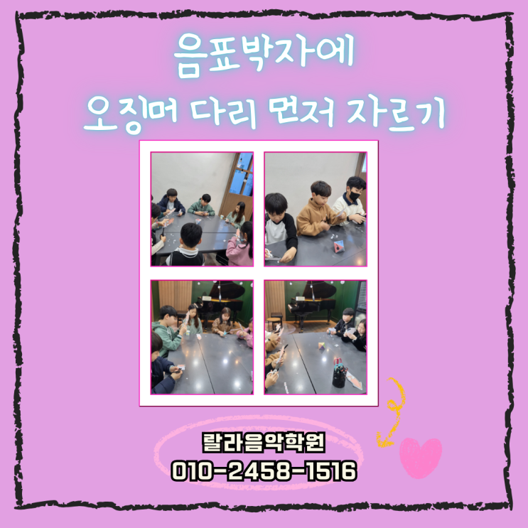 안녕하세요 랄라음악학원입니다. 날씨가 많이 춥습니다. 늘 감기조심하시고 건강 잘 챙기세요 :) 마산동음악학원, 음표박자에 오징머 다리 먼저 자르기 아이들이 가위로 무언가를 자르기 시작했어요. 진지한 표정으로 집중하며 작업하는 아이들의 모습, 그 안에는 음악 수업의 깊은 의미가 담겨 있답니다. 이번 시간에는 '박자 개념'을 좀 더 쉽고, 즐겁게 이해할 수 있도록 놀이와 창작 활동을 결합한 수업을 진행했어요. 마산동음악학원, 음표박자에 오징머 다리 먼저 자르기 바로 '오징어 다리 자르기 게임' 입니다! 음표와 쉼표가 적힌 작은 카드들을 순서대로 자르며 리듬과 박자의 구조를 직접 몸으로 느끼는 활동이었....... <img src="https://blogthumb.pstatic.net/MjAyNjAxMjNfMTAw/MDAxNzY5MTY2Njg0Mjg1.fH6SRT9FizRueC5LLvnTCiQzX1Sl-rzPAAkKNFtnIo4g.ZC8_Tz3YVZxy-E9CVfBWKBC9974o_FLUi9U1G1pLE1Ag.PNG/%B6%F6%B6%F3%C0%BD%BE%C7%C7%D0%BF%F6.png?type=s3" />