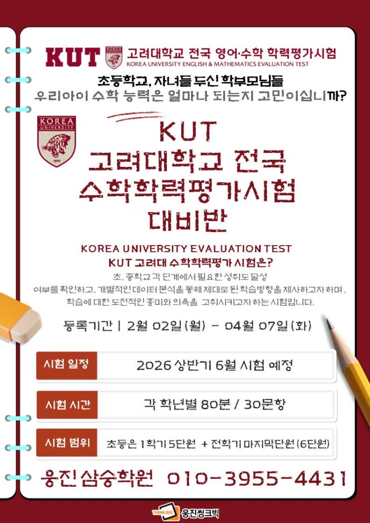 안녕하세요~ 웅진씽크빅 양주 장팀장입니다. 웅진씽크빅 삼숭학원에서 KUT고려대학교 수학 학력평가시험을 준비합니다. 웅진씽크빅 삼숭학원은 학습 결과보다 ‘과정’을 중요하게 보는 학습을 지향합니다. KUT 수학경시대회 준비 과정에서도 개념을 정확히 이해하고 왜 틀렸는지 스스로 점검하며 사고 과정을 말로 설명하는 연습 을 통해 시험을 위한 공부가 아닌, 실력을 키우는 공부로 연결합니다. KUT 고대 수학경시대회란? KUT(고대 수학경시대회)는 아이들의 수학 실력과 사고력 수준을 객관적으로 점검할 수 있는 전국 단위 수학 경시대회입니다. 단순히 문제를 많이 맞히는 시험이 아니라, ✔️ 개념 이해력 ✔️ 문제 해결 과정 ✔️ 사....... <img src="https://blogthumb.pstatic.net/MjAyNjAyMTJfMTA1/MDAxNzcwODcyNDM1OTc0.xgRPBt7LvCUyIEYX2ypj7MX_JH-07KVg2HGH6MW9GPEg.-MvqiDtoMTkc_rFBWIPOdIp9duT9X5Ni9tz3pZk0jxQg.JPEG/%BB%EF%BC%FE%C7%D0%BF%F8.JPG?type=s3" />