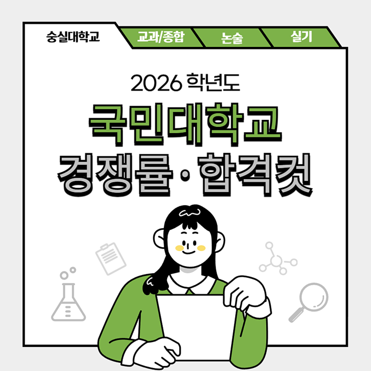 학생부교과(교과성적우수자 전형) 국민대학교 교과성적우수자전형은 전 계열에서 모집 규모가 크며 전체 경쟁률은 약 6.6대 1 수준입니다. 인문·사회계열은 6~9대가 중심이지만 일부 언어·미디어 계열은 10대 이상으로 상승해 체감 경쟁이 높습니다. 특히 지원층이 넓어 소폭 상향 지원이 섞이게 됩니다. 자연·공학 계열은 4~6대 경쟁률이 다수로 상대적으로 낮아 보입니다. 그러나 이는 이과 상위권 학생들이 교과전형을 전략적으로 활용한 결과입니다. 수학·과학 주요 과목 성취도가 합격을 좌우해 경쟁률 대비 합격선은 낮지 않습니다. 또한 국민대학교 교과전형은 수능 최저학력기준 2합 6을 충족해야 합니다. 교과 성적이 최상위권이라고 해....... <img src="https://blogthumb.pstatic.net/MjAyNjAxMzBfMTYz/MDAxNzY5NzU2MjcxMDQ1.XglWRyTiSIZl1zfzjdmEvY_B8Lv-fKnysC9Rj5xc6Rgg.L_ZYAVaaacQy8pNZQuPIGFRIAmc-1uQuvi1_GSE4Yiwg.PNG/%C0%D4%BD%C3%C1%A4%BA%B8_%BD%E6%B3%D7%C0%CF_%BA%B9%BB%E7%BA%BB-021.png?type=s3" />