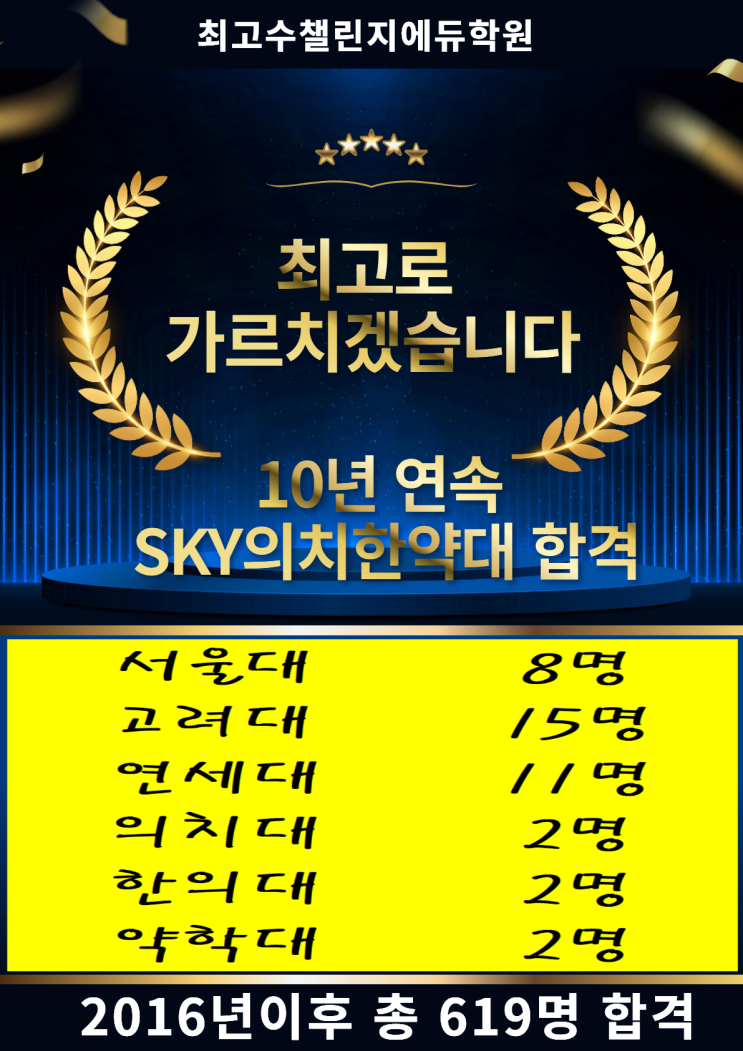최고로 가르치겠습니다 2026 입시결과 본원에서 배웠던 강OO(청원고3) 학생이 서울대에 합격하였습니다. 11년간 총 619명 그리고 10년 연속으로 최상위권대학에 합격시키는 쾌거입니다. 축하드립니다. #마들역학원 #최고수챌린지에듀 #최고수수학학원 #챌린지에듀학원 #고등수학 #고등영어 #고등국어 #고등과학 #청원고 #청원여고 #노원고 #수락고 #용화여고 #누원고 #상계고 #내신#수능 #모의고사 #중간고사 #기말고사 #입시진학 #마들역 #고3 #고2 #고1 #9년연속 #스카이합격 #의대합격 #치대합격 #약대합격 #한의대합격 #서울대합격 #고려대합격 #연세대합격 <img src="https://blogthumb.pstatic.net/MjAyNjAyMTBfMTg1/MDAxNzcwNzIxMjY4MjU5.oCf0TFPR6E0zDxQJdjt8wfkPOZ7ijzzBLlU8OOQKHuYg.gjnKiUm4PgDu41henEXBnZWTL3jtdPUOSZ6EMyGXL0Eg.PNG/%B4%A9%C0%FB_%BD%C7%C0%FB_26%B3%E22%BF%F910%C0%CF.png?type=s3" />