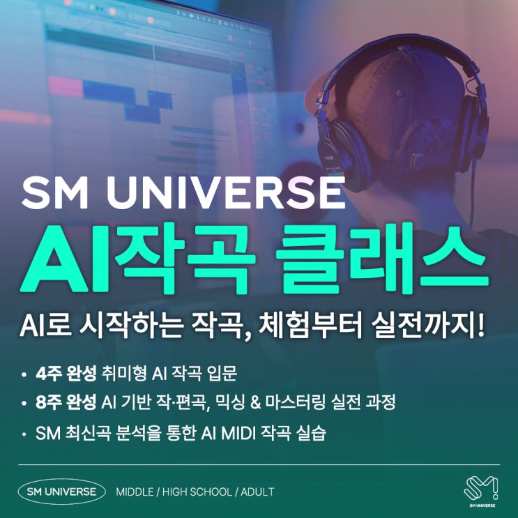 안녕하세요? 에스엠 유니버스입니다 AI작곡 체험 클래스 ▩ 클래스 소개 본 클래스는 음악적 지식이 없는 취미생 또는 비전공자도 즐겁게 함께하도록 구성된 AI 작곡 체험 과정입니다. AI와 함께하는 MIDI 작곡을 통해 SM 엔터테인먼트의 최신 곡들을 분석하고, 이를 바탕으로 나만의 음악을 만드는 시간을 갖습니다. ▩ 대상 (정원 : 11명) - 음악 비전공자, 취미로 AI작곡에 도전하고 싶은 초, 중, 고 및 성인 (초등은 초5,6 가능) ▩ 수업기간 및 시간 - 매주 금요일 오후7시~8시30분(90분) - 2026년 3월 6일 ~ 27일 (4회) ▩ 수강료 16만원(4주 기준) AI작곡 실전 클래스 ▩ 클래스 소개 음악적 지식이 있고, 음악 제작이 가능한 전공/프....... <img src="https://blogthumb.pstatic.net/MjAyNjAyMTBfMjE3/MDAxNzcwNzA1MzE1NDE2.NWwLLcebX6czqPy1xCVYwIta_LHE4mEhbvaMbQ1rUWcg.2ZismesFz2L5xad6XPCZwR9uIwLA8qn_M1b6kOgKL7sg.JPEG/250519_%C0%DB%B0%EE%B1%E2%C3%CA_%C1%A4%B9%E6%C7%FC.jpg?type=s3" />