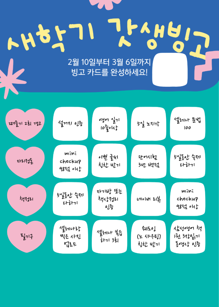 새학기가 시작되면 아이들도, 부모님도 마음이 분주해집니다. “이번 학기엔 잘 해볼 수 있을까?” “작심삼일로 끝나진 않을까?” 이런 고민 속에서 저희는 이번 새학기에 **‘새학기 갓생 빙고’**를 시작했습니다. 공부를 시키기보다, 참여하게 하고 싶었습니다 빙고판에는 공부뿐 아니라 아이들의 일상 습관도 함께 담았습니다. ● 영어 책 읽기 ● 셀레나 열심히 하기 ● 숙제 스스로 하기 ● 정리정돈 인증 ● 지각하지 않기 모두 아이 혼자서도 도전할 수 있는 것들입니다. ☆중요한 건 “해야 한다”가 아니라 “내가 해냈다”는 느낌이었습니다. 아이들의 반응은 예상보다 빨랐습니다 처음엔 “이거 다 해야 돼요?”라던 아이들이 벌써....... <img src="https://blogthumb.pstatic.net/MjAyNjAyMTBfMjM0/MDAxNzcwNjkwMzI5NjY4.HuPaTN9B1mlSOcSPs8wpoubYI4LdtI_loRAypTKLPm8g.hn_tjKE6IfyifcyETPBma3sIEtAHlEg1SccHFznX_VAg.PNG/900%A3%DF1770690318690.png?type=s3" />
