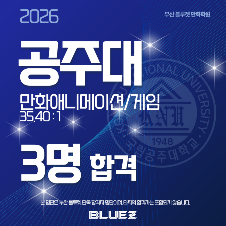 35.40:1, 국립대의 높은 벽을 넘어 3개 전공 동시 합격의 쾌거! 2026학년도 국립 공주대학교 입시에서 부산 블루젯 만화학원이 만화애니메이션, 게임디자인, 그리고 디자인컨버전스라는 3개의 각기 다른 전공에서 총 3명의 합격생을 배출했습니다. 국립 공주대학교는 탄탄한 커리큘럼과 높은 경쟁률로 수많은 수험생들이 선망하는 대학입니다 이 명단은 오직 부산 블루젯만의 단독 합격자 명단이며, 타 지역 합격자는 포함되지 않았습니다. 합격생의 이름과 출신 고교를 투명하게 공개하는 것은 결과에 대한 블루젯의 확신이자, 학부모님들과의 굳건한 약속입니다. 어떻게 3개 전공을 동시에 석권할 수 있었을까? 만화, 게임, 융합디자인. 이름은....... <img src="https://blogthumb.pstatic.net/MjAyNjAyMjRfMTMz/MDAxNzcxOTM1MTI2NDE3.LemD5slKiwUTL0C54-dDMi9rxaB7iqbqP1i12KO73pgg.S0o32GMxRRAWUJmslSYD6NEFE5Hd0FnUI_ODPFpS8bEg.PNG/38.png?type=s3" />