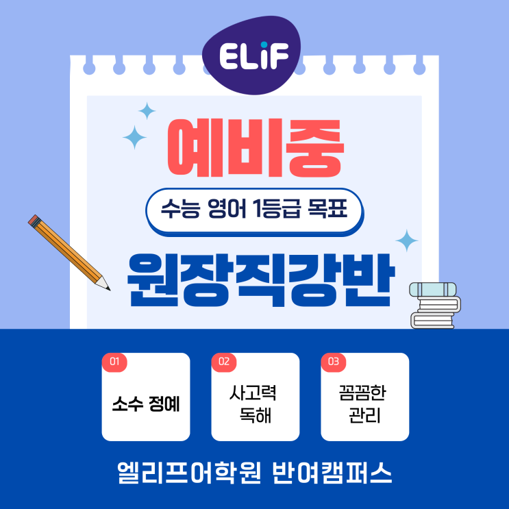 안녕하세요^^ 엘리프어학원 반여캠퍼스 원장입니다! 2026년도 3월에 개강하는 신규반 안내드립니다^^ 엘리프어학원 중등부 수업은, 주 3회, 2시간 씩! 레벨별/소수 정예/꼼꼼한 관리! 로 이루어집니다. 83점 -> 98점 까지! (올리기 힘든 점수 구간이죠?) 시험기간 내신대비는 꼼꼼한 1대1관리가 들어갑니다! 그렇다면, 중등 내신 시험기간이 아닐때는 어떻게 수업이 진행되나요? 아직도 문제풀이만 하고 있나요? 엘리프어학원에서는 원장 직강 수업! 찐 사고력 독해 수업이 진행됩니다!! 더이상 끊어 읽기, 구조분석 수업으로는 충분하지 않습니다. 주장-근거-전체 구조를 파악하는 수업! 비판적 사고, 질문하는 수업! 으로 훈련합니다. 레벨....... <img src="https://blogthumb.pstatic.net/MjAyNjAyMTlfMTEx/MDAxNzcxNDI4MDQ3MjY0.9xh5EMScCQP9CaUQ8m5C9cvMYaNRM6WDX17oUrbJbcYg.AGezVGkT1xg4jQwqMAbGr4X0MW0bEdU8Bnnp1RGN4WAg.PNG/%C6%C4%B6%FB%BB%F6_%B4%D9%C8%AB%BB%F6_%C0%CF%B7%AF%BD%BA%C6%AE%B7%B9%C0%CC%BC%C7_%BF%A9%B8%A7%B9%E6%C7%D0_%C6%AF%B0%AD_%C0%CE%BD%BA%C5%B8%B1%D7%B7%A5_%C6%F7%BD%BA%C6%AE.png?type=s3" />