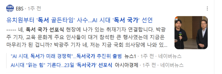 AI 시대에 따라 다시 거꾸로 가는듯한 교육의 흐름! 느껴지시나요? 독서와 글쓰기, 모든 과목의 뿌리, 국어가 가장 중요한 이유를 보여주는 제도가 국회를 시작으로 교육부, 학교, 사회, 개인으로 확장되며 다양한 사업이 추진되고 있습니다. 제이북에도 2026년에 학교, 도서관, 독서포럼 국가 자문 요청 등 다양한 강의 요청으로 바쁜 계획을 보내고 있습니다. 2026년 1월 23일, 대한민국 국회에서 선포된 '독서국가 선포식'과 '독서국가 추진위원회 출범식'은 AI 시대를 살아가야 할 우리 아이들에게 '생각하는 힘'을 길러주기 위한 국가적 생존 전략의 시작입니다. ️ 독서국가 선포식 주요 골자 (2026. 1........ <img src="https://blogthumb.pstatic.net/MjAyNjAxMzBfMTUg/MDAxNzY5NzQwNTY1MjYy.g_o41PcskTfq4AIJ1g6gDDR7RUfuyR-Ksb_xsoYp3FIg.vLDyJFTSR9jLmYPhEIccVLxxRTlFf1KSwiZiSO9-_lIg.PNG/image.png?type=s3" />