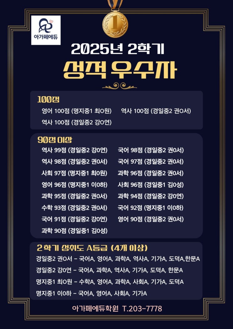 명지전과목아가페에듀학원<25년 2학기 성적우수자>
