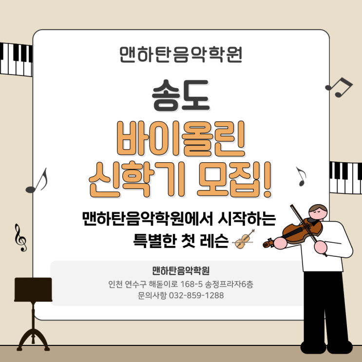 맨하탄음악학원에서 시작하는 특별한 첫 레슨 안녕하세요 송도 맨하탄음악학원입니다. 신학기를 맞아 바이올린 신입생을 모집합니다. 새 학년이 시작되는 시기, 아이에게 음악이라는 선물을 준비해보시는 건 어떠세요? 왜 바이올린일까요? 바이올린은 단순한 악기 교육이 아닙니다. ✔ 집중력 향상 ✔ 바른 자세 습관 형성 ✔ 섬세한 청음 능력 발달 ✔ 무대 경험을 통한 자신감 성장 활을 잡는 작은 손끝에서 아이의 표현력과 감수성이 함께 자랍니다. 맨하탄음악학원 바이올린 수업 ✔ 1:1 맞춤 레슨 ✔ 연령·수준별 체계적 커리큘럼 ✔ 기초 활 쓰기부터 곡 완성까지 단계 지도 ✔ 정기 발표회 및 연주 기회 제공 처음 시....... <img src="https://blogthumb.pstatic.net/MjAyNjAyMjdfMjE4/MDAxNzcyMTY4NjEzNDk3.TwG_xAOEsNIwzxqnZ5M8qmmAc3nFpKKhAu93C7l0-SQg.DPxZFrukwsvizwHy_kOq2G_zijdljZLLYJnpJkRuEi8g.PNG/%B0%C7%BF%EC-%C5%DB%C7%C3%B8%B4-066.png?type=s3" />