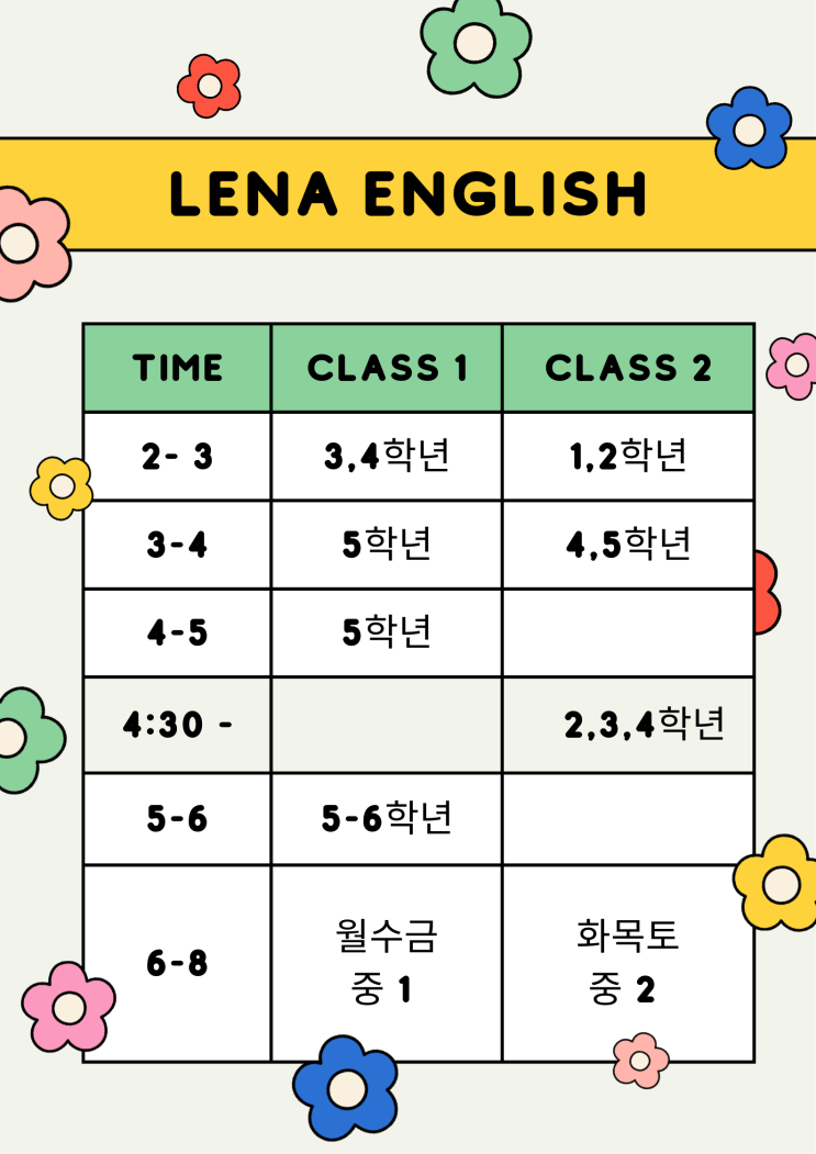 안녕하세요. 레나영어입니다. 2026학년도 시간표입니다. 새 학기를 맞아 레나영어 수업 시간표를 안내드립니다. 초등부 대부분 시간은 1-2자리만 여석 있습니다. 거의 모든 반 곧 마감됩니다. 중등부 그룹 +개별맟줌수업 진행합니다. 수업시간은 6시 시작이지만, 6시 전에 와서 단어테스트완료해야합니다. 내신대비기간에는 일요일도 수업이 있을 수 있습니다. 위 수업 시간표를 참고해 주시고, 궁금하신 점이나 상담이 필요하신 경우 언제든지 편하게 문의 주세요. 아이들이 즐겁게 배우면서도 올바른 학습 습관을 만들어 갈 수 있도록 레나영어학원이 함께 하겠습니다. <img src="https://blogthumb.pstatic.net/MjAyNjAzMDlfMTUz/MDAxNzczMDEyNzgwMjI3.weMrTRWLgcOuAF6eMt4X1CJ4WljRifEDKMKbA8NJH3kg.en6YnhHpk4Ay4ayLRb4IsbD_ylzHGnO9Mk2YMyvfPNYg.PNG/%B7%B9%B3%AA%BF%B5%BE%EE%BD%C3%B0%A3%C7%A5.png?type=s3" />