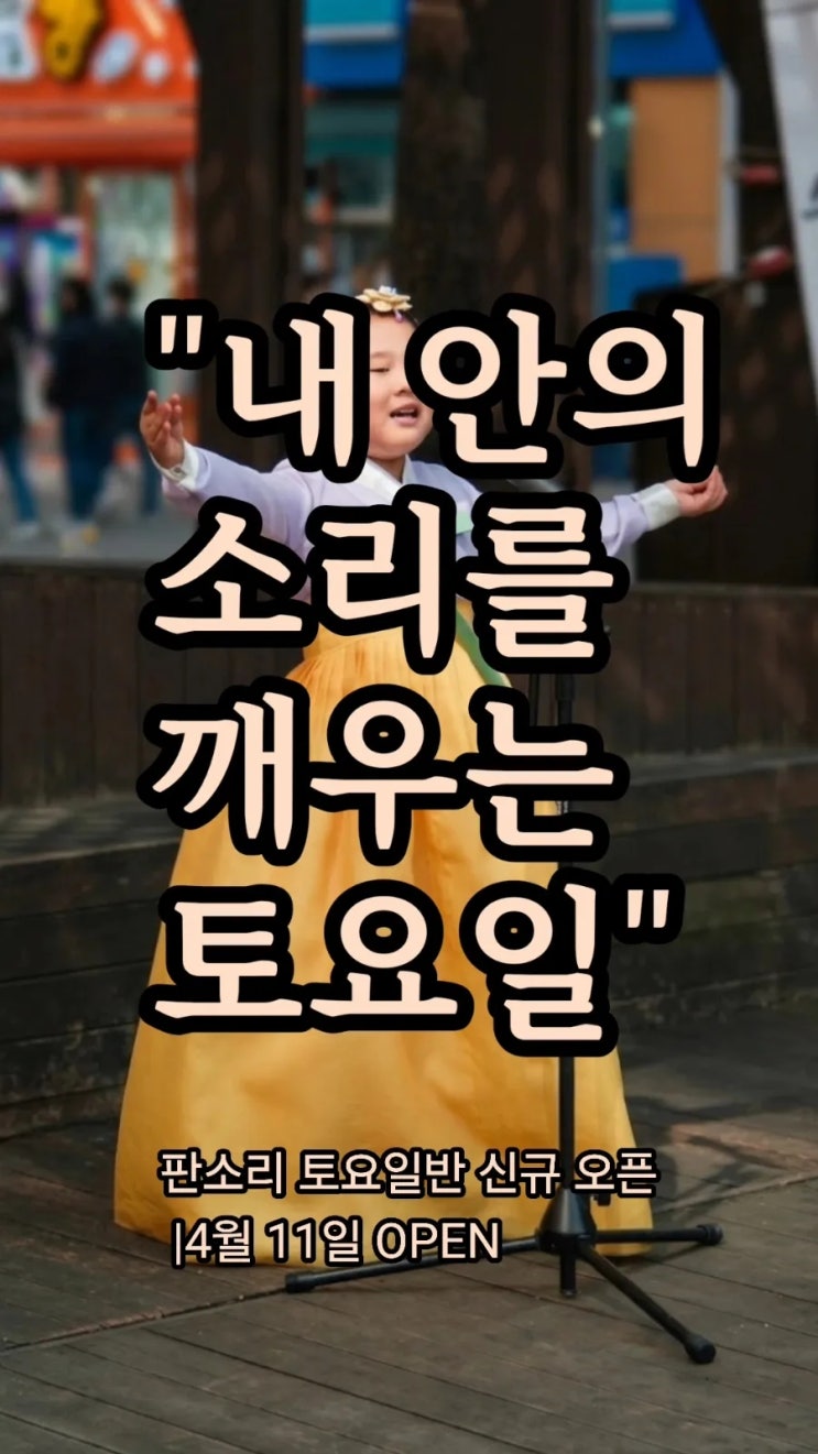 판소리를 배우고 싶었지만 평일 시간이 맞지 않아 고민하셨던 분들이 많았습니다. 그래서 단소야국악학원에서 판소리 토요일 개인레슨을 새롭게 오픈합니다. 판소리는 우리 전통음악 중에서도 소리와 장단, 감정 표현이 어우러지는 매력적인 예술입니다. 처음 배우는 분들도 기초 발성부터 차근차근 시작할 수 있습니다. 판소리는 이런 분들께 추천합니다 ✔ 판소리를 취미로 배워보고 싶은 분 ✔ 새로운 취미로 국악을 시작해보고 싶은 성인 ✔ 발표력과 자신감을 키우고 싶은 학생 ✔ 국악 전공이나 입시를 준비하는 학생 연령과 목적에 맞게 개인 맞춤 레슨으로 진행됩니다. 판소리를 배우면 좋은 점 판소리는 단순히 노래를 배우는 수업이 아....... <img src="https://blogthumb.pstatic.net/MjAyNjAzMTZfMjE3/MDAxNzczNjQ2MjkzMjMy.xXrXaIdspUVuzDJUKicN98rp6nNuwtDwjJfdKnXHs8kg.8MK60ZH9Yr23lMxAG0jHUww8OwSFqZR3BsxgNhBy2Xcg.JPEG/900%A3%DF%C1%A6%B8%F1_%BE%F8%C0%BD%A3%AD2026%A3%AD03%A3%AD16%A3%DF00%A3%DF16%A3%DF59%A3%AD1%A3%A81%A3%A9.jpg?type=s3" />