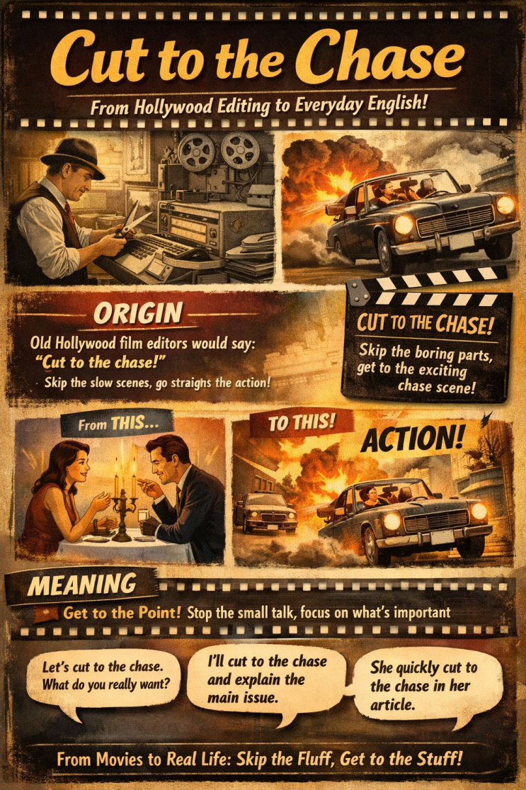 안녕하세요, 보정동 영어학원 원셀영어 입니다. 오늘은 학생들도 좋아하고 시험·실생활 다 써먹기 좋은 표현 하나 갑니다. 바로 cut to the chase. 1️⃣ 의미부터 딱 정리 cut to the chase 군더더기 설명은 그만하고, 본론으로 들어가다 우리말로 제일 자연스러운 번역은 “말 돌리지 말고 핵심부터 말해” “결론부터 말해” ✔ 상대방의 장황한 설명이 시작될 때 ✔ 회의, 토론, 일상 대화에서 시간 아끼고 싶을 때 아주 잘 쓰이는 표현이에요. 2️⃣ 어원: 왜 하필 ‘chase’일까? 이 표현의 뿌리는 초기 할리우드 영화 편집입니다. 예전 영화들은 앞부분에 로맨스, 설명, 설정이 길고 관객이 진짜 보고 싶어 하는 건 마지막 추격....... <img src="https://blogthumb.pstatic.net/MjAyNjAyMjZfMjY0/MDAxNzcyMDg2Nzg4MzU1.AOu1KWH-ySjkr7NsZVutpBE6UwzJvJPnGeKi0bcNVhMg._s3BAS8MD3C-gDzzqB9jI-ZSwKW50TsCZ1wXmCw65OUg.PNG/34c2500d-6824-40ab-bacc-b6c61f443dd4.png?type=s3" />