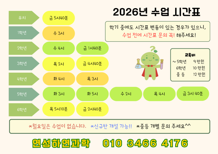 *월요일은 수업이 없습니다. (용현동 수업) 학기 중에도 시간표 변동이 있는 경우가 있으니, 수업전에 꼭!! 문의 하시고 결정하세요. 수업이 없는 시간에 신규반 개설 가능 합니다. 중등 개별 문의 주세요. <img src="https://blogthumb.pstatic.net/MjAyNjAyMjdfNiAg/MDAxNzcyMTg5MDAzNjY5.Hh-aN-rwu8DMsNnUczGyOWozCBEJm1IWVD3j8Th1mzEg.EkmzI8rjwt-5T8k2_qQPexTA4fpwoX5Am_WBaiOp6pEg.PNG/26%B3%E2%B5%B5_%BC%F6%BE%F7_%BD%C3%B0%A3%C7%A5_%281%29.png?type=s3" />