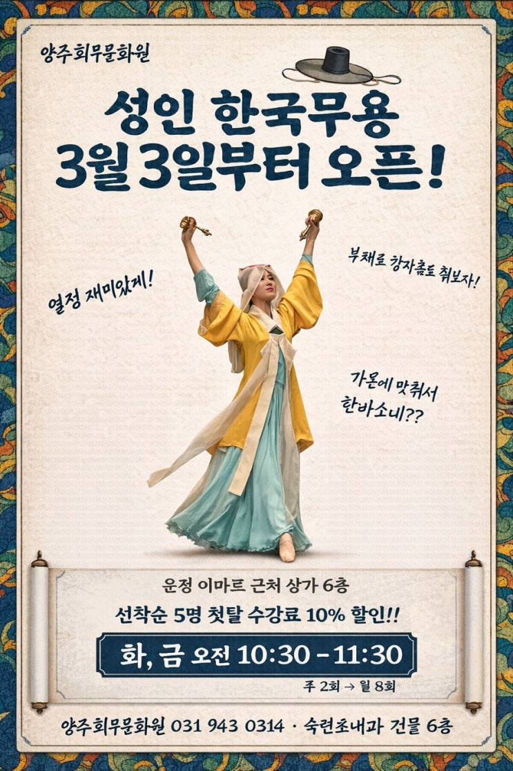안녕하세요! 양주희무용학원입니다 많은 분들이 기다려주셨던 운정 성인 한국무용 클래스가 드디어 3월 3일부터 새롭게 오픈합니다! “한국무용은 어렵지 않을까요?” “몸이 굳어서 따라갈 수 있을지 걱정돼요.” 처음 시작하시는 분들도 전혀 부담 없이 오실 수 있도록 기초부터 차근차근, 몸의 호흡과 선을 살리는 수업으로 진행합니다. ⸻ 이런 분들께 추천드려요 ✔ 우아한 움직임을 배우고 싶은 분 ✔ 스트레스 해소가 필요하신 분 ✔ 가요에 맞춘 작품도 재미있게 해보고 싶은 분 ✔ 나만의 취미 시간을 만들고 싶은 분 우리 가요에 맞춰 한바탕 신나게! 또는 감정 절절하게 ~~ 그리고 한국무용 특유의 깊이 있는 호흡까지 함께....... <img src="https://blogthumb.pstatic.net/MjAyNjAyMjRfMTUz/MDAxNzcxODk0OTc2MjEy._3k2Kh7BnqJto1RAU47o0fW_k1Mh3BidXgF49IOY8tUg.KA4y7Ok5nc4e5x0tQ1DWTqRXGxaVmr2WrCVXBpAUodAg.JPEG/C9EB1805%A3%ADF34C%A3%AD4771%A3%ADB812%A3%AD8DA405E7E7EC.jpg?type=s3" />
