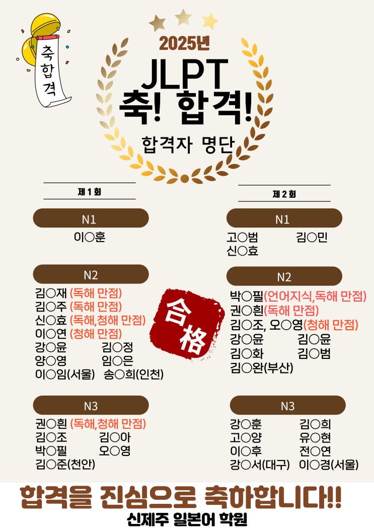 2025년 JLPT 합격을 축하드립니다!! - 신제주일본어학원