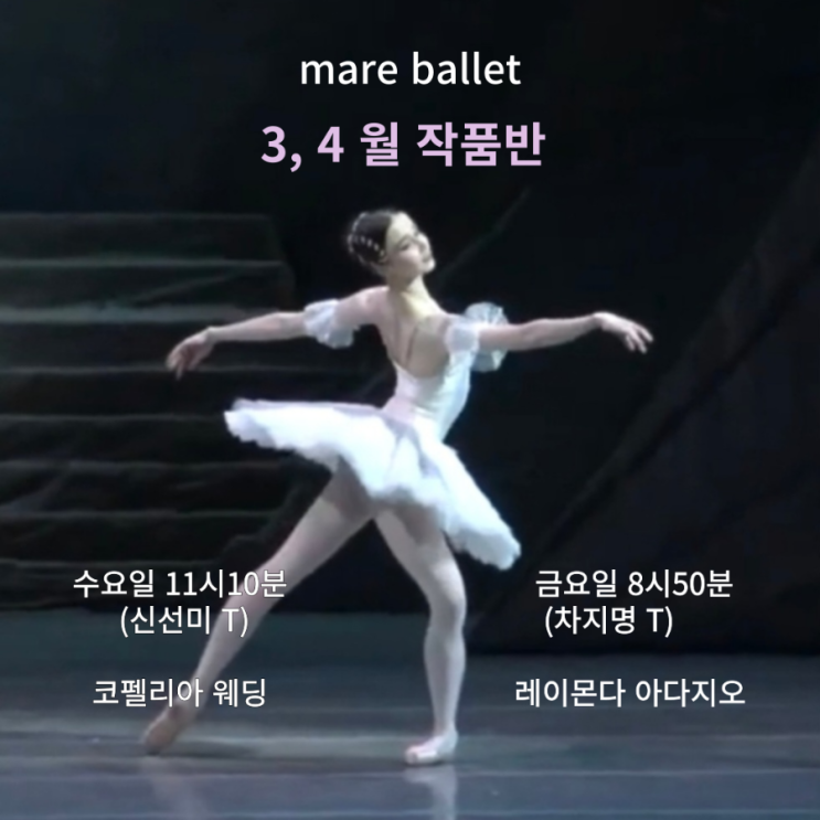 마레발레학원 3–4월 작품반 발레를 배우는 이유는 완벽해지기 위해서가 아니라, 내 안에 숨어 있던 감정을 꺼내기 위해서일지도 몰라요. 이번 3–4월, 두 개의 클래식 작품으로 ‘동작’을 넘어 ‘표현’을 배웁니다. 수요일 11:10 | 신선미 T 코펠리아 웨딩 사랑스럽고 밝은 에너지가 가득한 작품. 미소, 시선, 손끝의 결까지 가볍지만 우아하게 담아냅니다. “나도 이렇게 밝게 춤출 수 있구나” 하는 순간을 만나게 될 거예요. ⠀ 금요일 8:40 | 차지명 T 레이몬다 아다지오 고전 발레의 깊이와 품격. 천천히 호흡하며 균형을 잡고, 선을 길게 쓰는 시간. 조용하지만 강한 우아함을 배우는 작품입니다^^ ⠀ 두 달 동안 한 작....... <img src="https://blogthumb.pstatic.net/MjAyNjAyMjNfNDYg/MDAxNzcxNzczODcwOTg5.tZjpd0HVzYzy2gmRnj-lFDeVh_TwBnYZLXbbQRJZpKsg.K9spkBJ2iEIEq-IlICVxXmmT3ucNdJVF5XKNOB2nbpcg.PNG/900%A3%DF1771772473226.png?type=s3" />