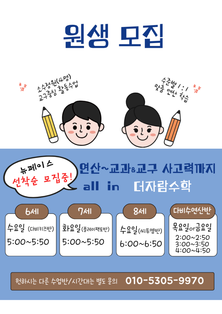 다비수 연산 & 플레이팩토 & 씨투엠 교구 사고력 수학을 모두 할 수 있는 홍제동 더자람 수학교습소에서 뉴페이스 원생을 모집합니다. 시간대별 모집 정원이 정해져 있어 선착순 마감하오니 * 평소 교구사고력 수업에 관심 있으셨거나 * 6세가 되길 기다렸던 친구들은 서둘러 연락주세요~ <img src="https://blogthumb.pstatic.net/MjAyNjAyMjVfMTE2/MDAxNzcxOTk2MTk3NDA5.tarknmBgZR43VnEVXwu-apBxdVwACrDHNHjLElmiFrog.OfRv3rjla3YQ4MeVnXbuz1oYJGIn5yzhuEBdBBrnO7sg.PNG/3%BF%F9_%BD%C5%C0%D4_%BF%F8%BB%FD%B8%F0%C1%FD%28A4%29.png?type=s3" />