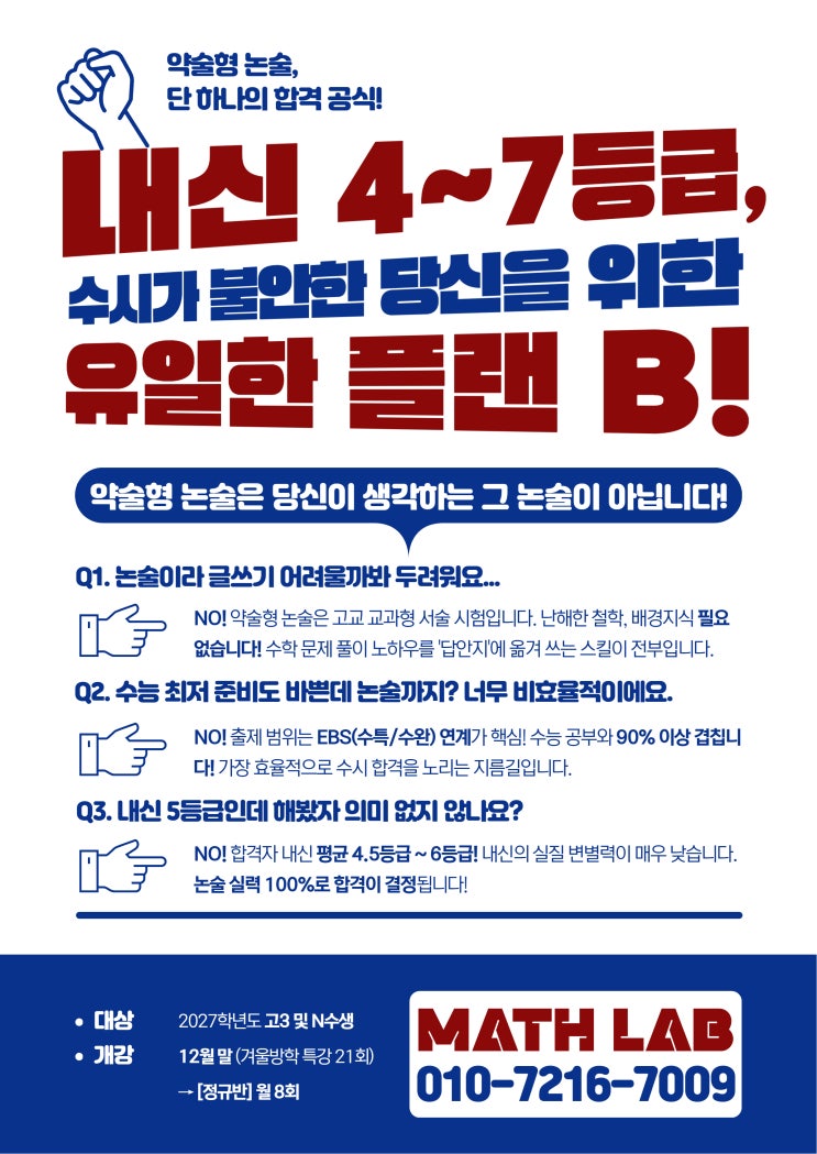 [강릉 매쓰랩] 내신 4~7등급, 인서울 대학 합격 비결 공개! (12/20 설명회 + 에어팟 이벤트)약술형논술! 강릉수학학원 매쓰랩입니다. 오늘은, 약술형논술에 대해 간단히 설명하고, 이번주 주말에 있는 설명회 안내드리리려고합니다. 기말고사가 끝나고 받아든 성적표, '내신 4~7등급'이라는 숫자 앞에서 "나는 인서울은 틀렸어..." 라며 한숨 쉬고 있지는 않나요? 수시를 포기하기엔 너무 이르고, 정시에 올인하기엔 너무 불안한 지금. 여러분의 입시 판도를 뒤집을 유일한 플랜 B, <약술형 논술>을 소개합니다. "내신 5등급도 인서울, 정말 가능한가요?" 네, 가능합니다. 단, 남들과 똑같은 방법으로는....... <img src="https://blogthumb.pstatic.net/MjAyNTEyMTRfMTAy/MDAxNzY1NzE3MDIxNjEy.otXQ0P1hgzcywPcGZekEdlBf3-DX1zopxYx7uuCG3GQg.zefnvBbyprYJv22CsXVB4Fm412EBkhihtawodq05DH0g.JPEG/KakaoTalk_20251106_201652515.jpg?type=s3" />