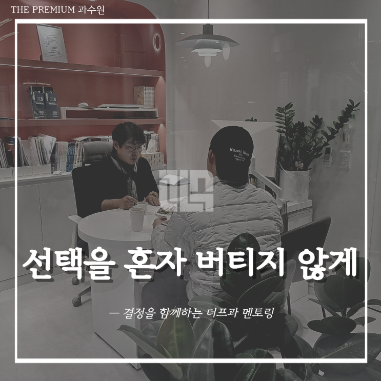더프리미엄과수원 등록번호 4399 안녕하세요. 더프리미엄과수원 입니다.. ♂️♀️ 상담은 시작이고, 멘토링은 과정입니다 요즘 상담을 하다 보면 비슷한 고민을 정말 자주 듣게 됩니다. “열심히는 하고 있는데 맞는 방향인지 모르겠어요.” “이 선택이 맞는지 확신이 없어요.” “혼자 결정하려니 너무 불안해요.” 공부가 힘들어서라기보다 결정을 혼자 감당하고 있기 때문입니다. 왜 이렇게 흔들릴까요? 대부분의 학생들은 대학 · 학과 · 등급은 생각하고 있지만 그걸 어떻게 가져가야 할지는 정리되어 있지 않습니다. ✔ 지금 내 위치는 어떤지 ✔ 이 목표가 현실적인지 ✔ 혹시 흔들릴 경....... <img src="https://blogthumb.pstatic.net/MjAyNjAxMDhfNzQg/MDAxNzY3ODgxNTA1Nzcz.Q_Z-HVjzi1-z0Nm_4qH41qeOF3DZbDUu9FxagJHRtiEg.TSWWVvSR1QnliZC3FGpEByw5W-fU7azEZVHo3jnCj-Ig.PNG/1.png?type=s3" />