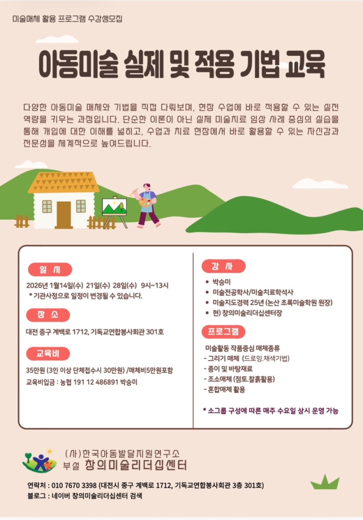 20년간 미술학원을 운영해 온 노하우를 바탕으로, 미술치료 현장에서 바로 적용할 수 있는 아동미술 기법을 전문적으로 배우는 교육입니다. 치료사의 지지와 촉구가 실제 개입으로 어떻게 이어지는지, 적절한 매체 제시와 함께 작품의 완성도를 높이는 구체적인 기술을 직접 실습하며 익히게 됩니다. 작업 과정을 통해 성취감이 자신감으로 확장되는 경험을 나누며, 치료사가 먼저 성장하고 치유되는 시간을 함께 만들어 가고자 합니다. 아동미술 실제 및 적용기법 <img src="https://blogthumb.pstatic.net/MjAyNjAxMTJfNzIg/MDAxNzY4MjI2ODQ3NzQ5.k9X17cpRUTWO_rqMFcjVG40QQK-GfvSRiMHQf4RNFnwg.AXoLqESoudyKjPYuJaT0yeVFxguxDA2bV3Lf8SsAcnsg.JPEG/IMG%A3%DF8353.jpg?type=s3" />