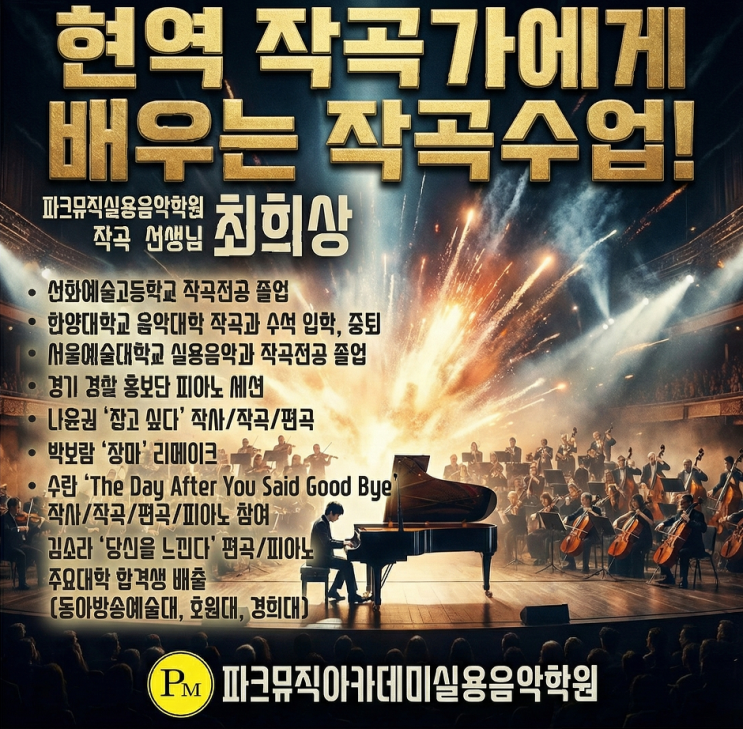 안녕하세요!! 2007년부터 19년동안 인천 대표 실용음악 입시전문학원으로 높은 합격률로 증명하고 있는 연수동 작곡학원 파크뮤직아카데미 실용음악학원입니다!! ▼ 파크뮤직에게 궁금하신 점은 ▼ 저희 파크뮤직에는 2015년부터 11년동안 작곡입시를 책임져 주고 계시는 현역 작곡가이자 입시 배테랑 선생님께서 계십니다! 바로 실용음악과의 NO.1 서울예술대학교 실용음악과 작곡전공 졸업과 경기 경찰 홍보단 피아노 세션으로 제대하신 실력파 최희상선생님이신데요!! 파크뮤직 = 강사진 좋은 학원! 파크뮤직 = 합격률 높은 학원!! 이라는 이야기를 많이 듣곤 합니다. 저희 파크뮤직이 왜 합격률이 높을 수 있는 이유와, 지금 현재....... <img src="https://blogthumb.pstatic.net/MjAyNjAxMjZfMTk1/MDAxNzY5NDM2MDA2Nzcy.-4lzICHexCY67a56g2ZsfUVgY0eYkSYLEIY30OIC8KUg.v2MYRo8sTZg9SEgPkMPrS2SKpXg2czyU9GWSzJ4RL2Ag.PNG/%BF%AC%BC%F6%B5%BF_%C0%DB%B0%EE%C7%D0%BF%F8.png?type=s3" />